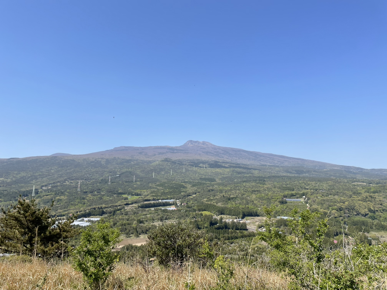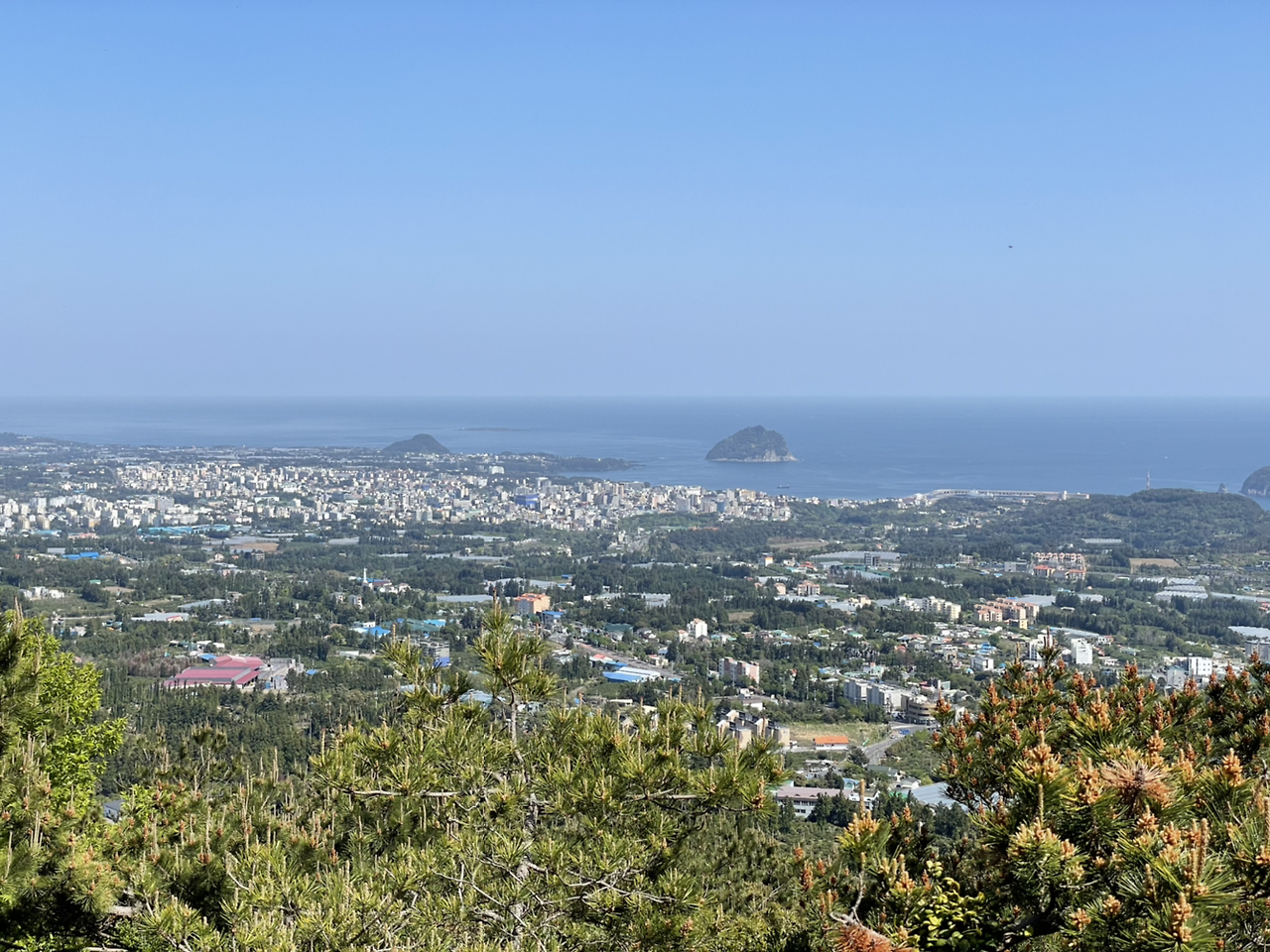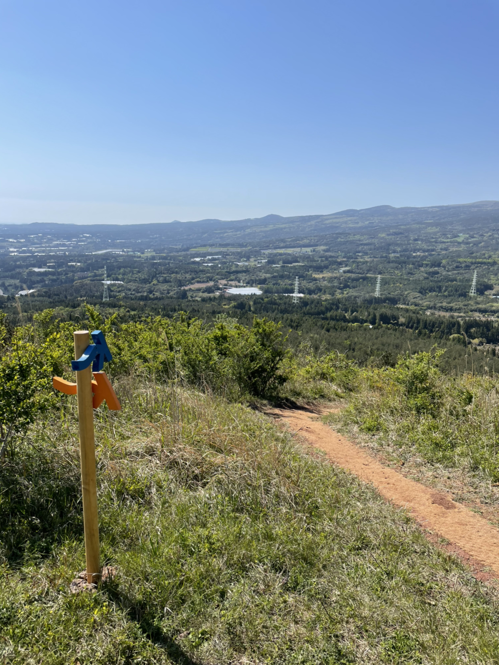 이제 본격적으로 오름 시작이다. 길쭉길쭉 삼나무, 잘 만들어진 나무계단, 나무 사이로 가끔씩 들어오는 바람의 조화가 어우러진 길이다. 계단은 점점 가팔라지고 숨도 가빠진다. 숨이 턱 밑까지 차 오를 무렵 고근산 정상에 다다른다. 바로 분화구를 한 바퀴 돌게 만든다. 숨을 고르며 작은 분화구를 돈다. 멀리 서귀포 구 시가지가 보인다. 한라산도 또렷하게 모습을 드러낸다.