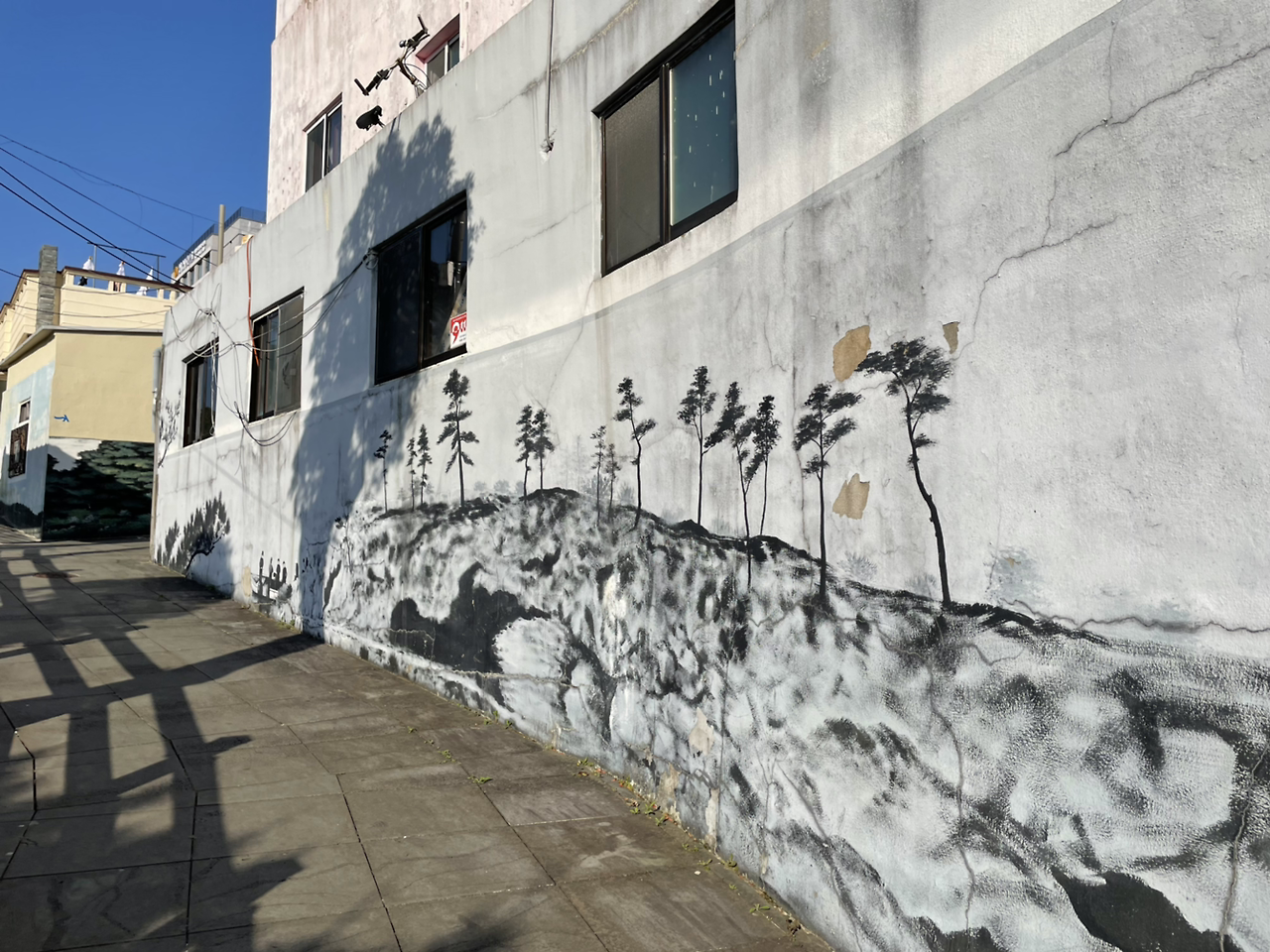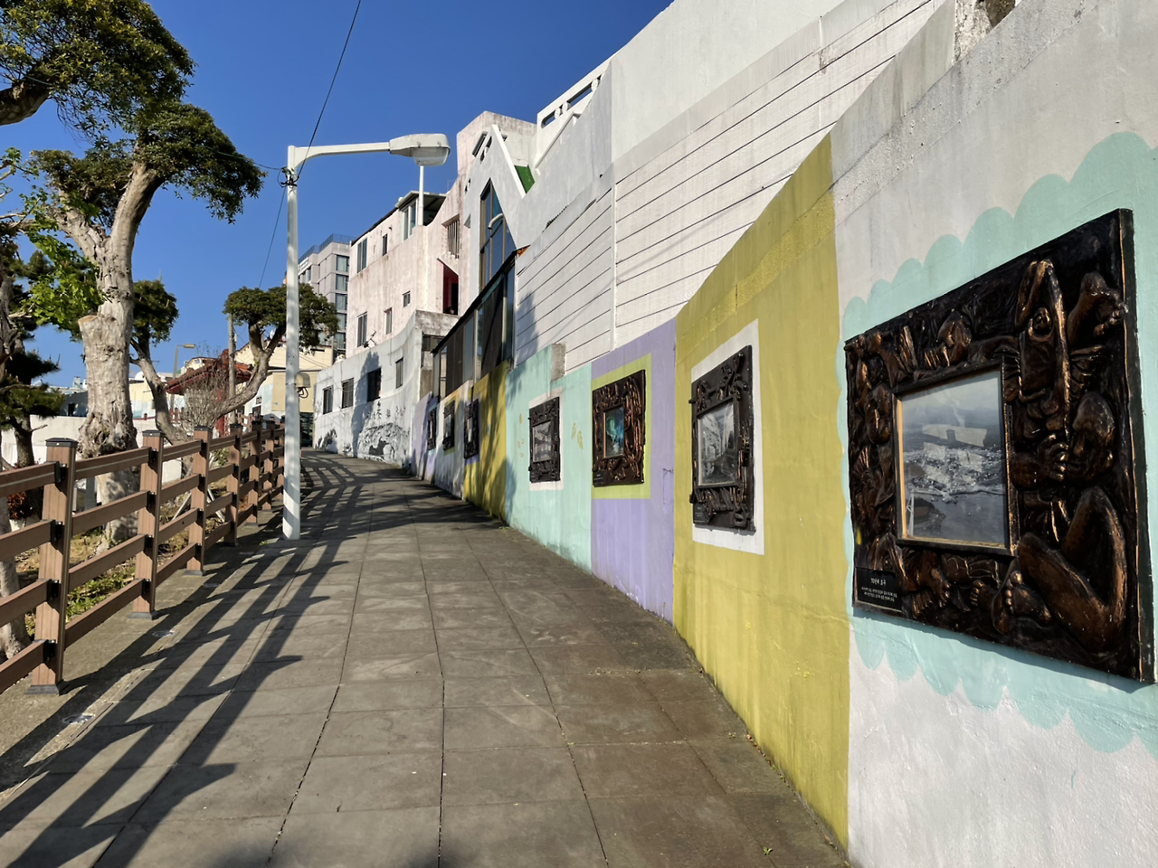 하논 분화구를 오른쪽에 두고 잘 닭인 도로를 내려가다 작은 마을로 들어선다. 조금 더 가니 서귀포 구시가지가 나온다. 이내 리본은 걸매생태공원으로 안내한다. 올레 안내소 도착을 앞두고 마지막으로 에어 샤워를 시켜준다. 도심 속에 이런 생태공원이 있다니 넘 좋다. 오메. 한라산도 보인다. 공원을 벗어나는 길도 벽화와 예전 사진으로 잘 꾸며 놓았다.