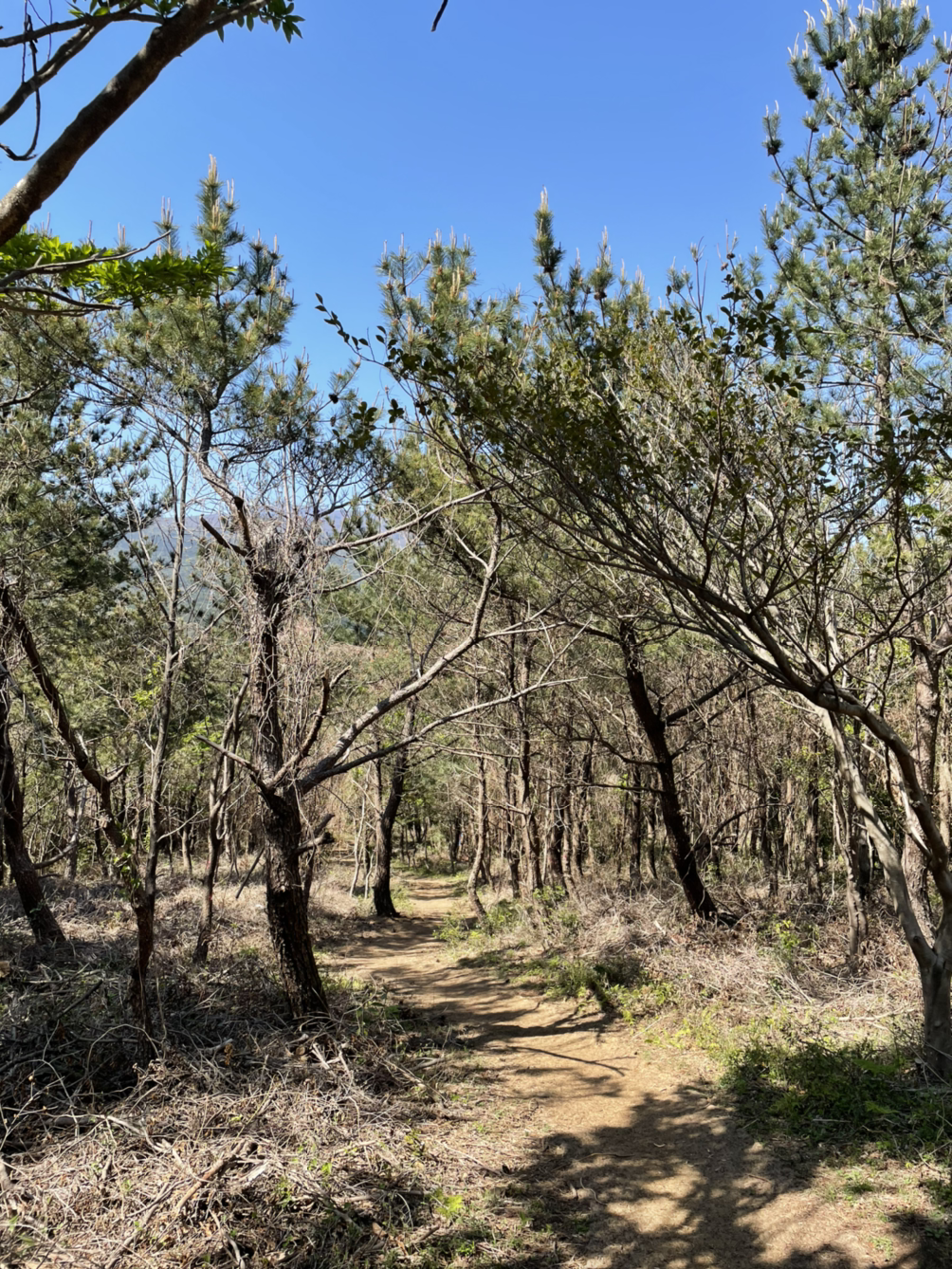 오후 2:50에 고근산 정상에서 소시지 한 개, 귤 2개로 주린 배를 보충하다. 이제 하산하는 일만 남았다. 내려간다. 하산길은 올라올 때와 풍경이 사뭇 다르다. 꼬불꼬불 나무, 계단도 아닌 그냥 산길.