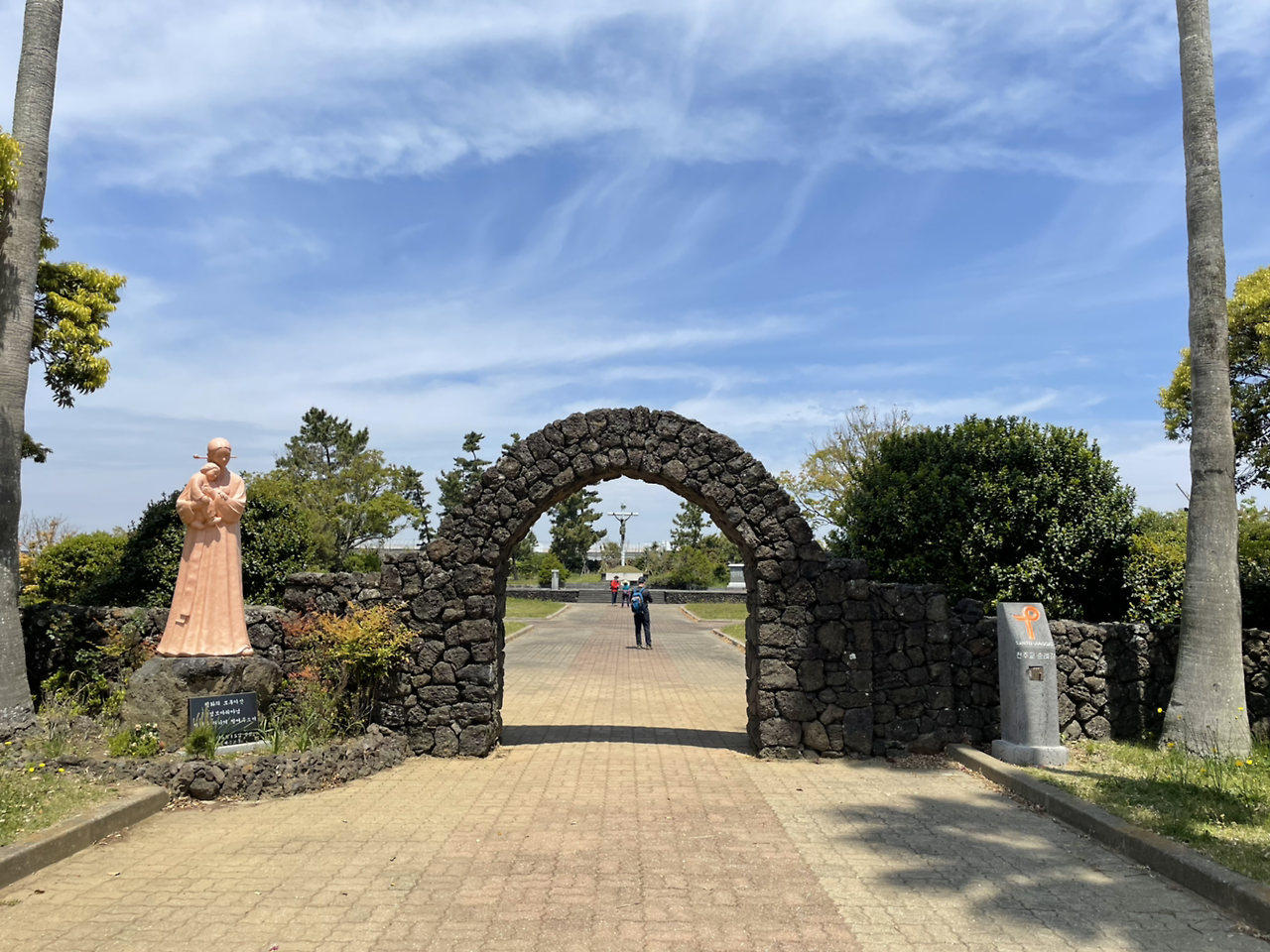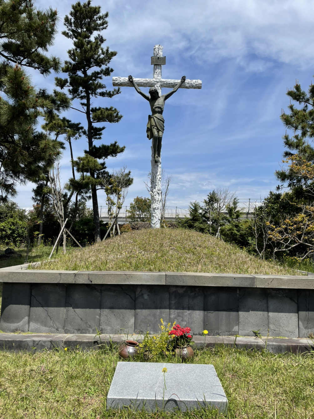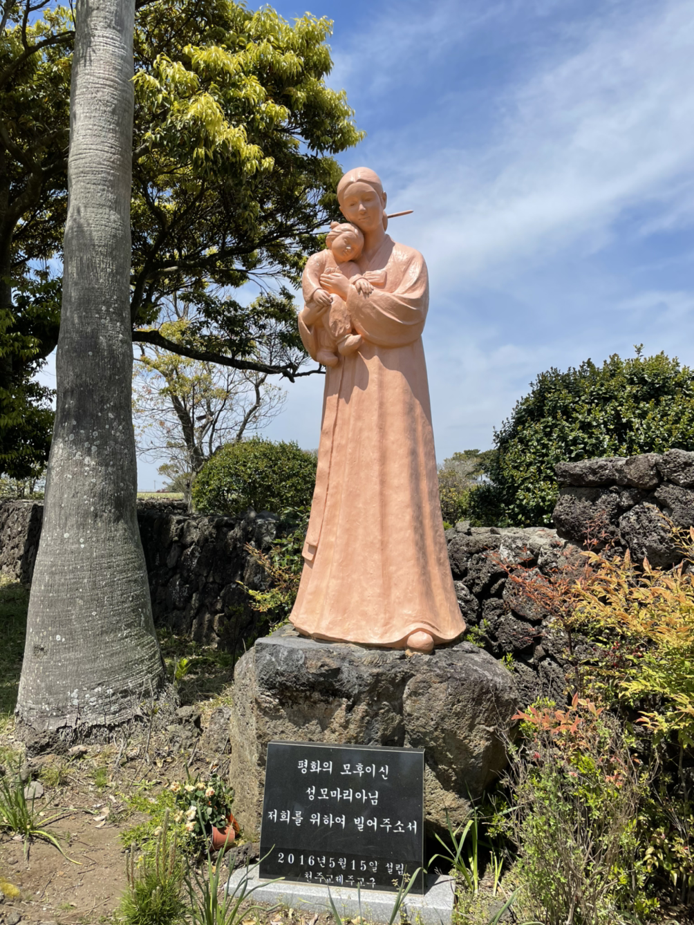 1시간을 달려 대정읍에 있는 정난주 님의 묘를 찾았다. 입구의 모자상부터 눈물짓게 만든다. 혼자 터벅터벅 걸어 들어와 노란 꽃 한 송이를 바친다. 눈물이 또 터졌다. 하염없이 운다. 그리고, 올레길을 무사히 마쳐 가는 것과 여기를 찾게 해 주심에 감사했다. 모자의 영원한 안식과 행복도 기원했다. 홀로 무덤 앞에서 흘쩍이고 있는데 천주교 신자분인 올레꾼 두 분이 들어오셔서 기도하신다. 난 묘 좌측으로 가서 눈물을 훔친다.