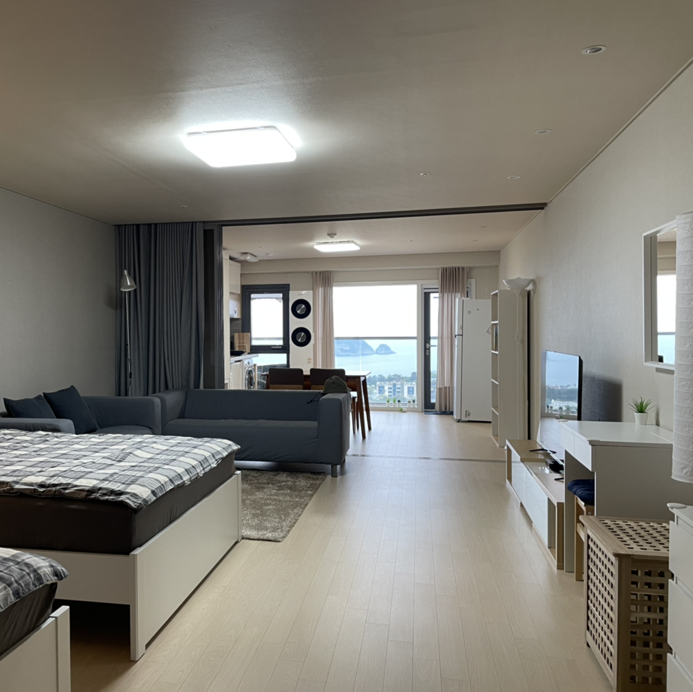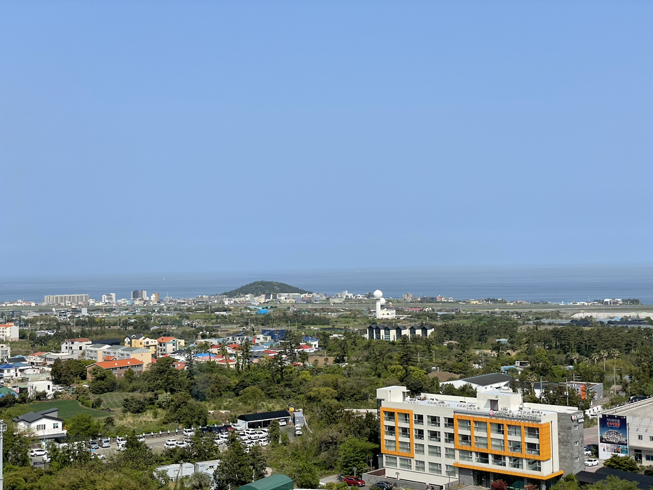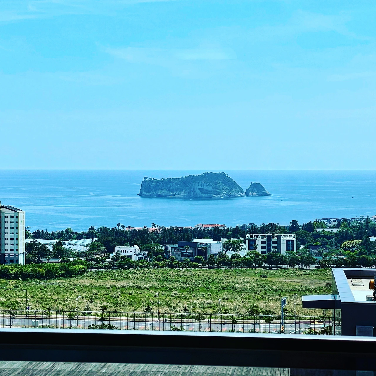 이제 서귀포 숙소로 들어간다. 제주 유포리아 지식산업센터 안 숙소인데 전혀 숙소가 있을 것 같이 않은 오피스 빌딩이다. 그 안에 들어갔더니 저 멀리 범섬이 바로 눈 앞에 펼쳐지는 것이 아닌가? 와우. 여기 있으면 전망 좋은 카페를 찾아가서 글 쓸 필요가 없겠다. 웬만한 카페 전망보다 배로 좋다.