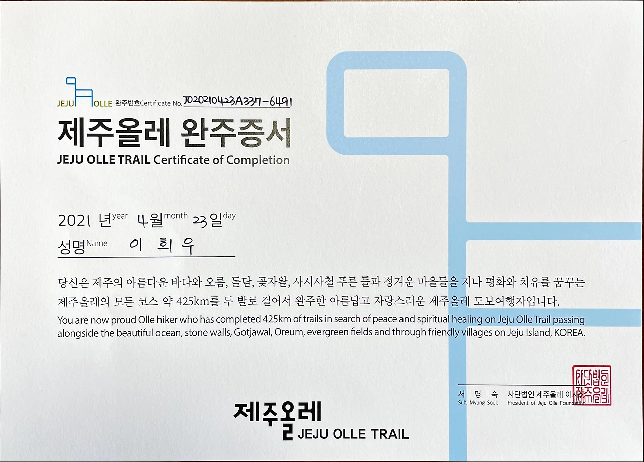 당신은 제주의 아름다운 바다와 오름, 돌담, 곶자왈, 사시사철 푸른 들과 정겨운 마을들을 지나 평화와 치유를 꿈꾸는 제주올레의 모든 코스 약 425Km를 두 발로 걸어서 완주한 아름답고 자랑스러운 제주올레 도보여행자입니다.