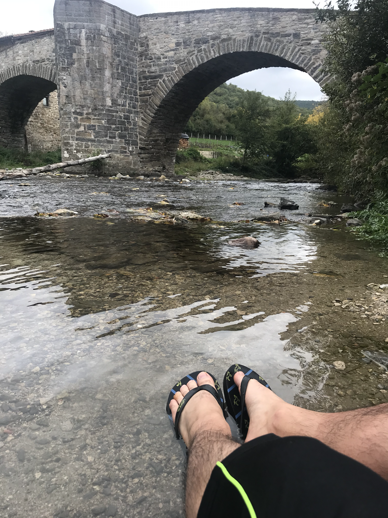 힘이 드니 헛소리가 나온다. 이를 악물고 계속 걷는다. 뒤에 오던 순례자들이 다 나를 제친다. 그래도 처벅처벅 천천히 걷는다. 저 앞에 물소리가 들린다. 돌다리를 건너니 바로 알베르게가 있다. 비록 알은 배겼지만 알베르게에 묵을 수밖에.