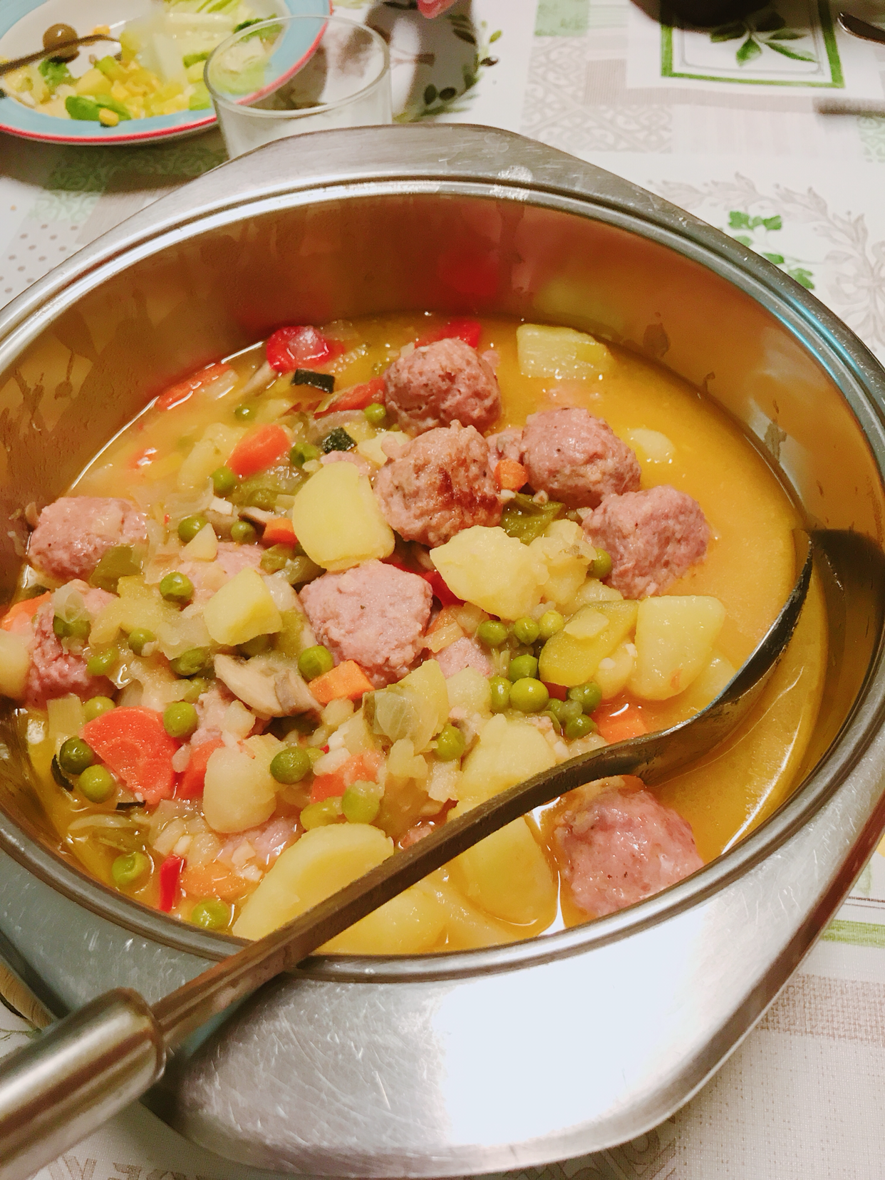 기도를 대신한 찬트가 끝나고 식사에 돌입했다. 사실 무료 숙박에 나오는 무료 식사라 크게 기대를 안 했는데 풍성한 샐러드에 미트볼 요리는 여느 식당의 10유로짜리 순례자 메뉴보다 나았다. 기부를 부르는 정성과 맛이었다. 와인까지 부딪치며 같이 식사하는 모든 순례자가 만족해한다. 7유로 기부만으로 부족해서 오늘 식사 한 20인분 설거지까지 하기로 했다.