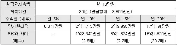 매월 10만원씩 30년간 저축한다면 총 저축 원금은 3,600만원이다.