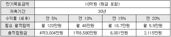 이번에는 노후 자금 10억원을 30년 동안 마련할 때 수익률에 따른 필요 저축액을 계산해 보자.