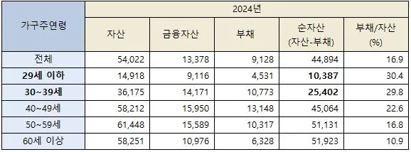 29세 이하의 경우 짧은 직장생활 기간을 감안할 때 예상보다 순자산 액이 크다.