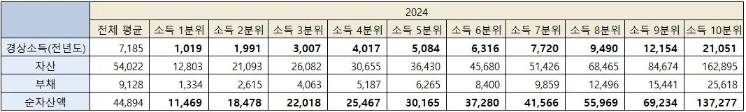 2024년 '가구주 연령별' 순자산 액과 '소득분위별' 순자산 액 자료를 활용한다.