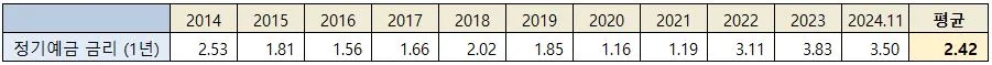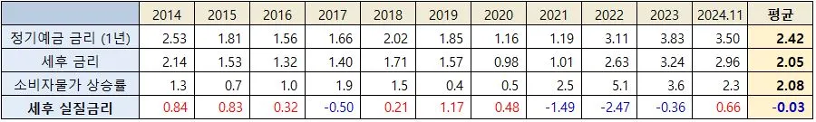 매년 정기예금 금리에서 세금(이자소득의 15.4%)을 공제한 세후 금리를 보면 10년 평균 2.05%였다.