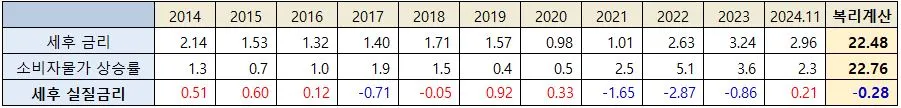 세후 평균금리가 물가상승률에 미치지 못한다.