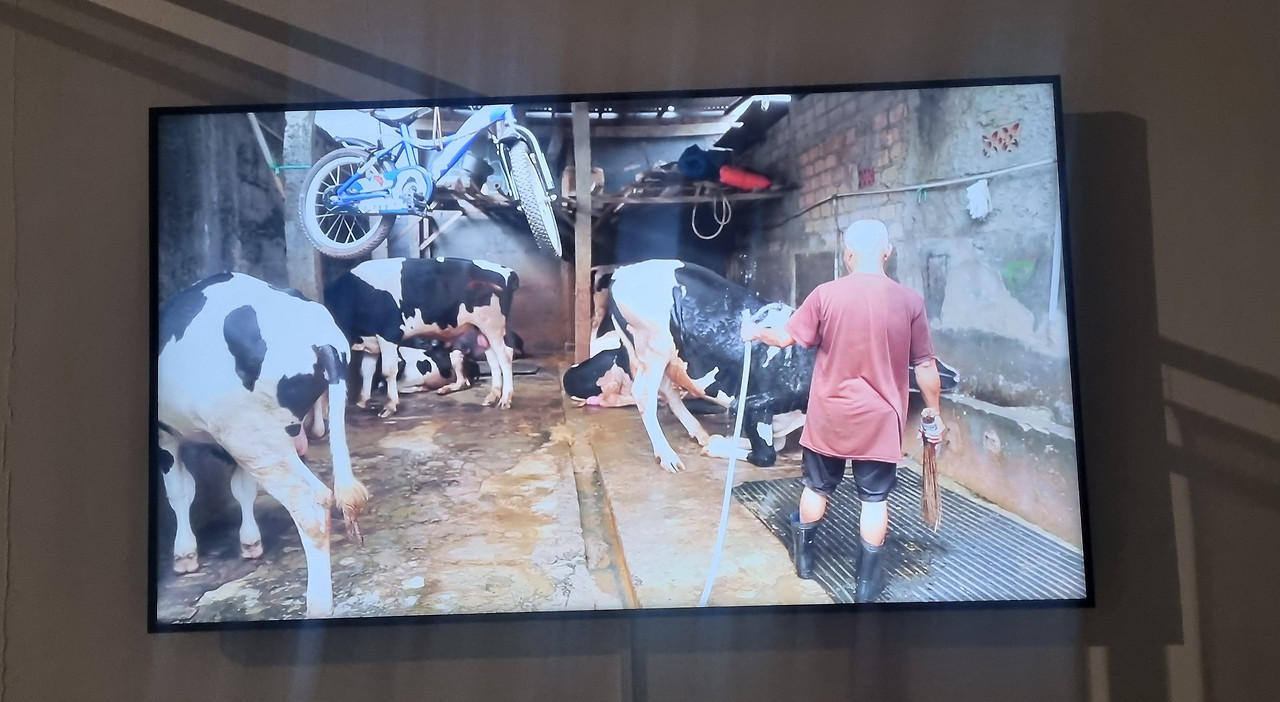 가장 인상적이었던 비디오 작품이다. 내가 소를 진료하는 동물병원에 근무하고 있으니 홀스타인 소에 시선이 갈 수밖에 없다. 우리가 흔히 아는 검은색과 흰색의 얼룩소는 젖소중에 가장 유량이 많이 나는 홀스타인 품종이다. 젖을 짜는 소는 암소다. 너무 당연하지만 가끔 잊을 때가 있다. 그리고 젖을 짜려면 출산을 해야 한다. 그러니까 젖소는 일 년에 한 번씩 출산을 하고 새끼를 낳았으니 젖을 낸다. 그런데 암송아지를 낳으면 젖을 짜기 위해 키우지만 수송아지를 낳으면 어떻게 할까? 우리는 홀스타인 품종의 수소에 대해 알고 있는 게 있을까? 수소는 당연히 젖소가 아니다. 젖소는 젖을 짜야 젖소다.