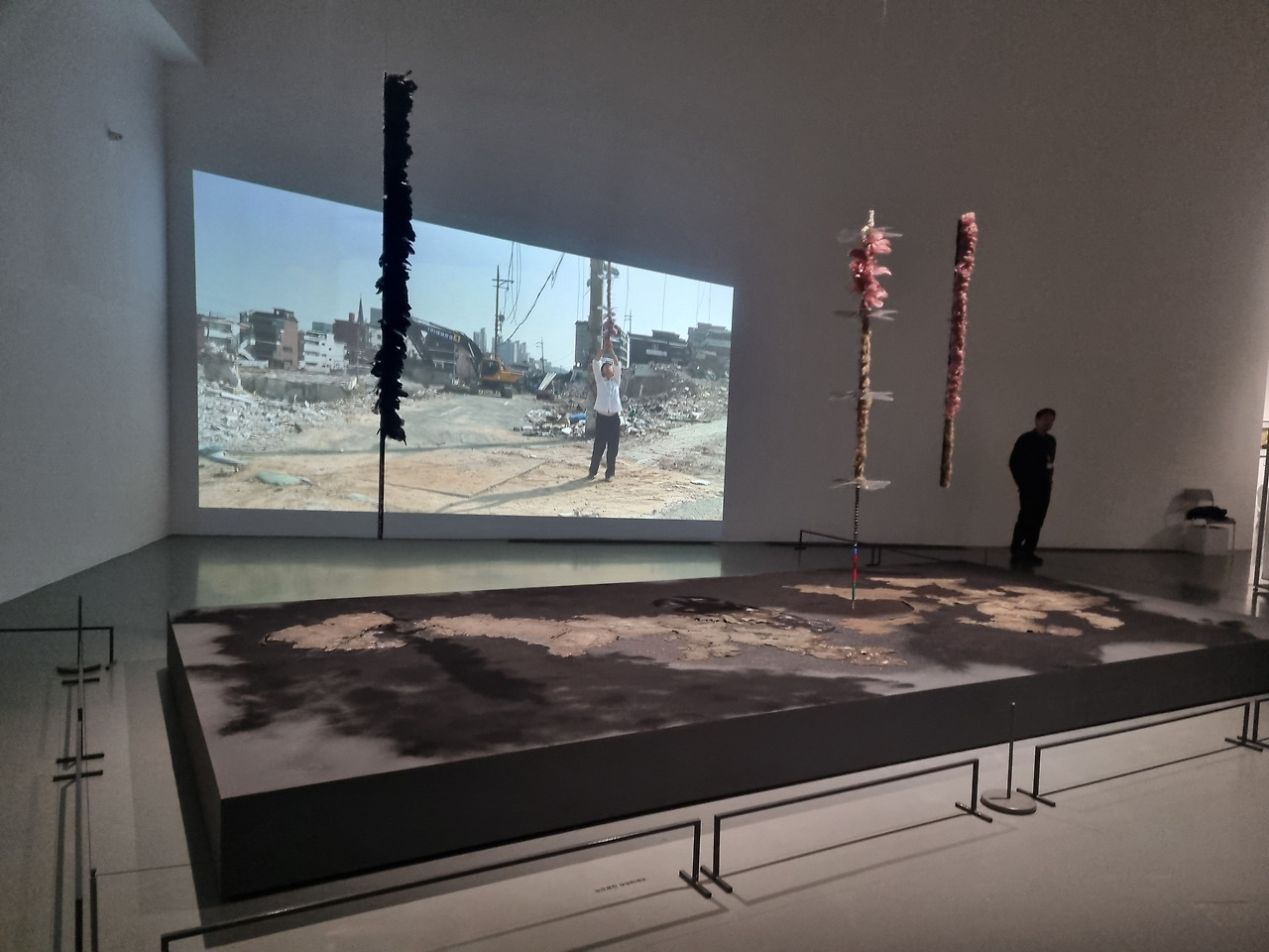 <꼬리와 뿔은> 라텍스 지도에 세 개의 포터블 키퍼를 연결하여 영토를 재맥락 화하는 과정의 작품이다. 전시장에서 처음 마주한 작품이 비물질 전이라는 전시의 정체성을 확연하게 드러내고 있었다. 작품 설명이 없으면 절대 이해할 수 없는 작품이다. 나는 포터블 키퍼의 의미를 이해하기 좀 어려웠지만 이 전시의 방향은 알 수 있었다.