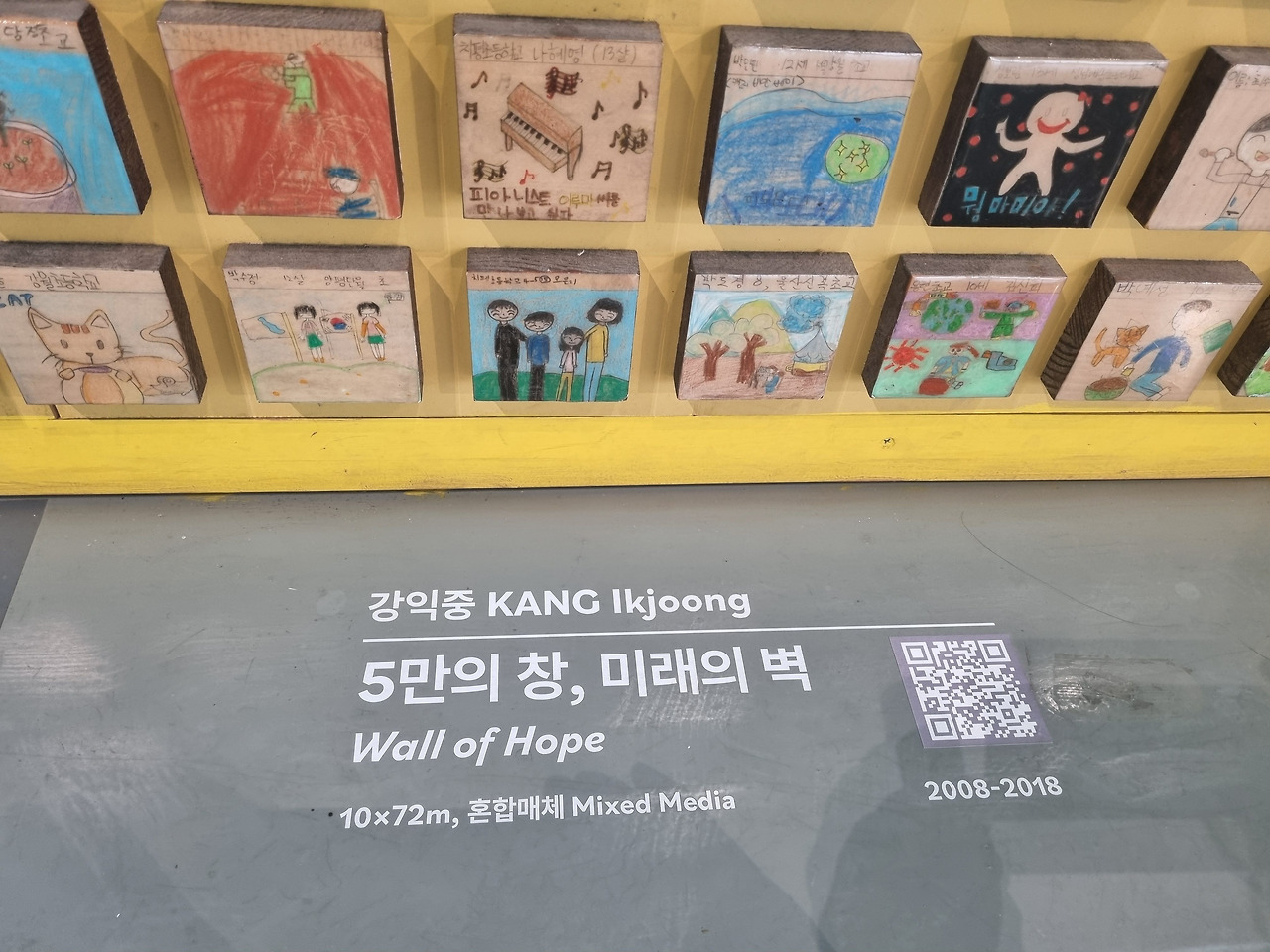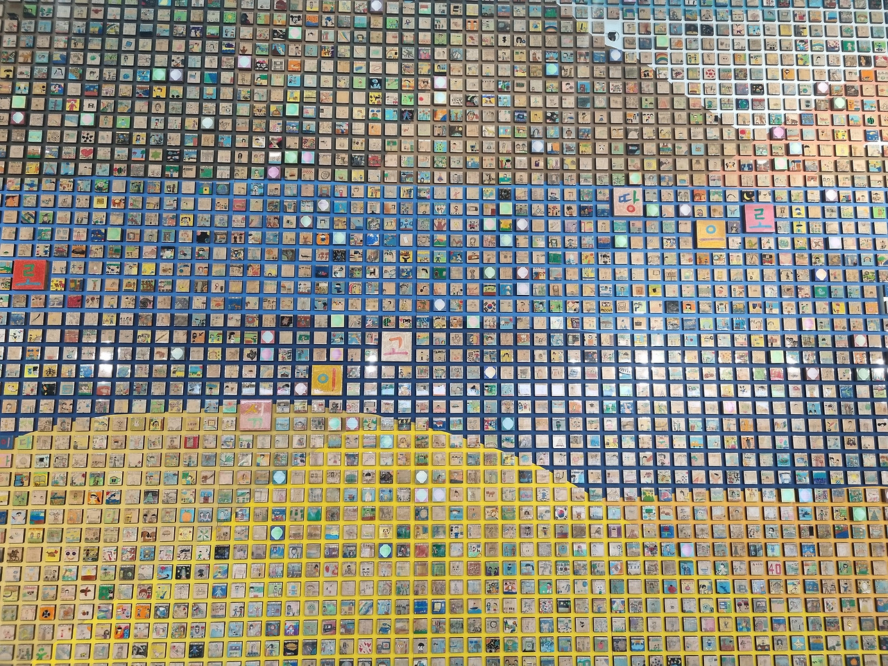 이층으로 올라가는 길 친숙한 타일 작품이 보인다. 강익중 작가의 타일 작품은 어린이들의 참여로 공공예술에 적합한 서사를 만들어낸다.