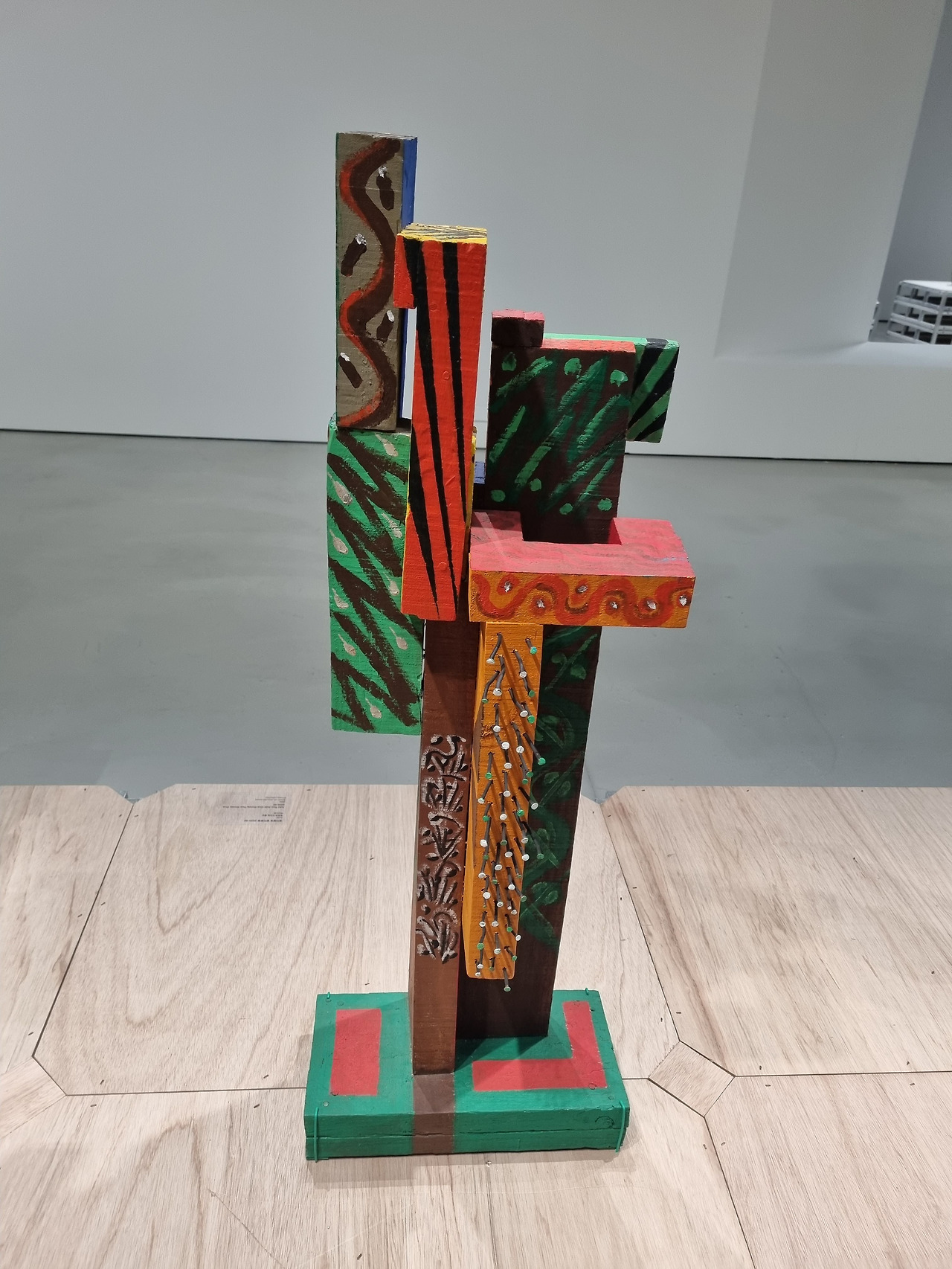 코로나 시기 나무를 구할 수 없던 김윤신은 자투리 나무에 채색을 하며 작품 활동을 했다. 그녀는 언제나 난관에 부딪쳤고 그 난관을 보기 좋게 헤쳐 나가며 새로운 작업으로 넘어갔다. 채색은 다양한 원주민들의 전통 문양으로 발전하기도 하며 또 다른 세계로 나아간다.