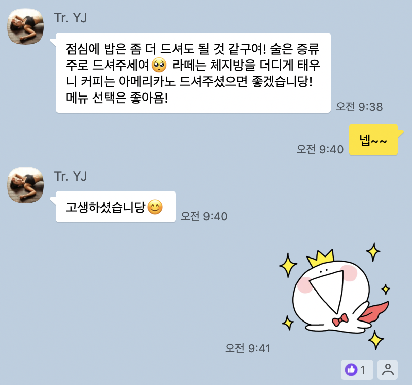예전에 운동과 식단을 할 때는 이런 요청을 받으면 왠지 덜먹어야할 것 같고, 왠지 안먹어야할 것 같고 그런 음식들이 있었다. 그래서 식단을 찍어서 보내라고하면 괜히 덜먹고 보내야할 것 같아서 평소보다 적게 먹고 보냈었는데 그러면 내가 알 수 있는 정보가 줄어든다는 것을 깨달았다. 일단, 먹은 것들을 솔직히 정확히 찍어서 보내면 무조건 먹지 말라는게 아닌 왜 먹으면 안돼는지, 대체로 어떤걸 먹으면 되는지 등 정보를 얻을 수 있다. 그래서 난 제약이 있는 몇가지 음식을 제외한 것들은 자유로이 먹으면서 찍어보내고 있다.