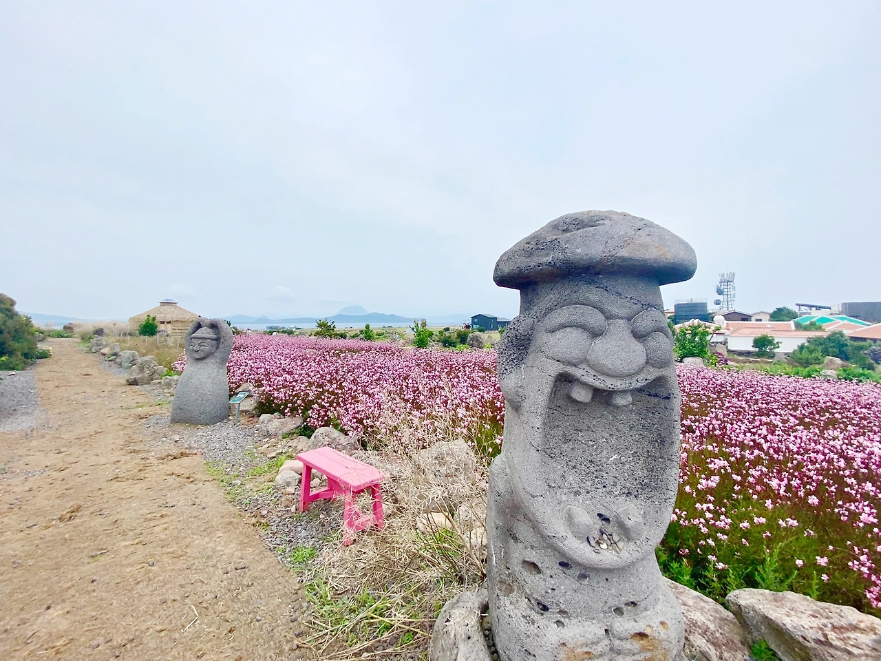 2시간 단위로 사람들이 들고 나서인지 한산한 가파도를 여유롭게 둘러볼 수 있었다. 드넓은 평지의 섬! 마을 안쪽으로 들어서면 돌담길과 가파도 전망대가 나온다. 전망대에 도착하면 이름 모를 꽃들과 익살스러운 하르방들이 반겨준다. 풍경 감상은 요기까지.