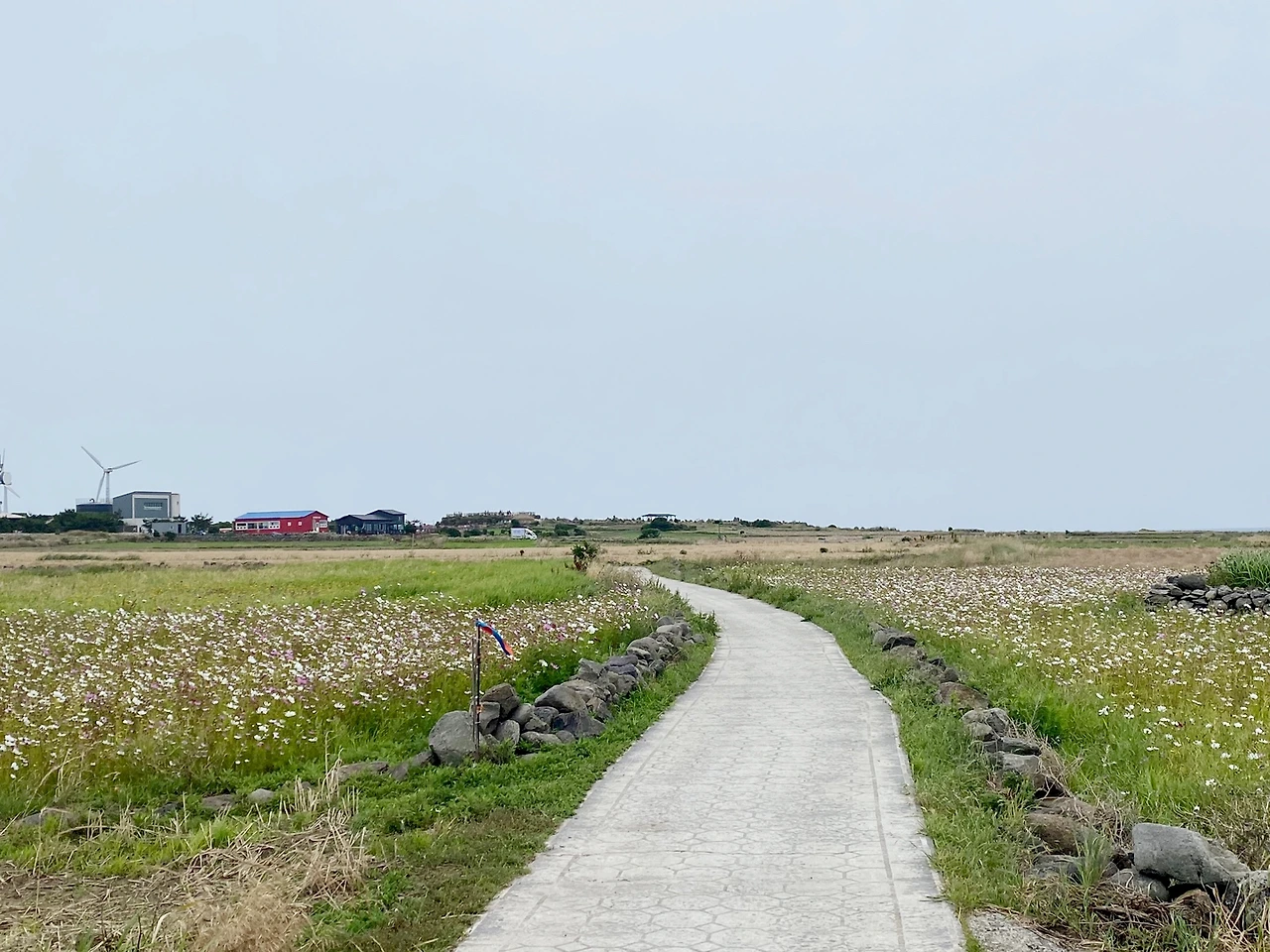 날이 흐려 햇빛은 없었지만 안개도 먼지도 없어 시야가 트인 좋은 날씨였다. 가파도는 나무가 우거진 숲지대가 없다. 오히려 땡볕이었다면 걸어 다니기 힘들었을 듯하다. 날이 흐려준 덕분에 수월하게 돌아볼 수 있었다. 여기저기 피어있는 들꽃이 청보리 시즌을 맞춰오지 못한 섭섭함을 달래주었다. 멀리는 이번 여행에서 오며 가며 눈에 자주 띄던 산방산이 여지없이 가파도에서도 보였다.