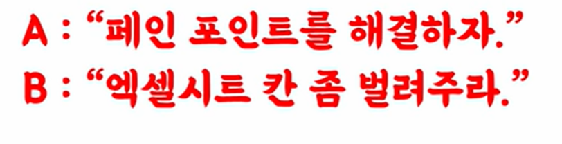 좁은 엑셀시트의 칸을 페인 포인트라고 기꺼이 표현하는 것이야 말로 일을 잘하는 척하기 좋은 것이다. 회사라는 것은 삼각형으로 이루어져 있다. 가장 윗사람인 회장, 허리인 팀장, 다음에 실무하는 사람의 말이 각기 존재하는데, 각자의 말을 들여다보면 '일하는 환경'이 보인다. 일을 하는 구성원은 언어로 파악된 업무환경과 핏을 맞추어야한다. 그러니 각각의 사람들이 개념어(실무언어)를 쓰는지 추상어(붕붕떠 있는 추상화된 언어)를 쓰는지 주목해 보라.