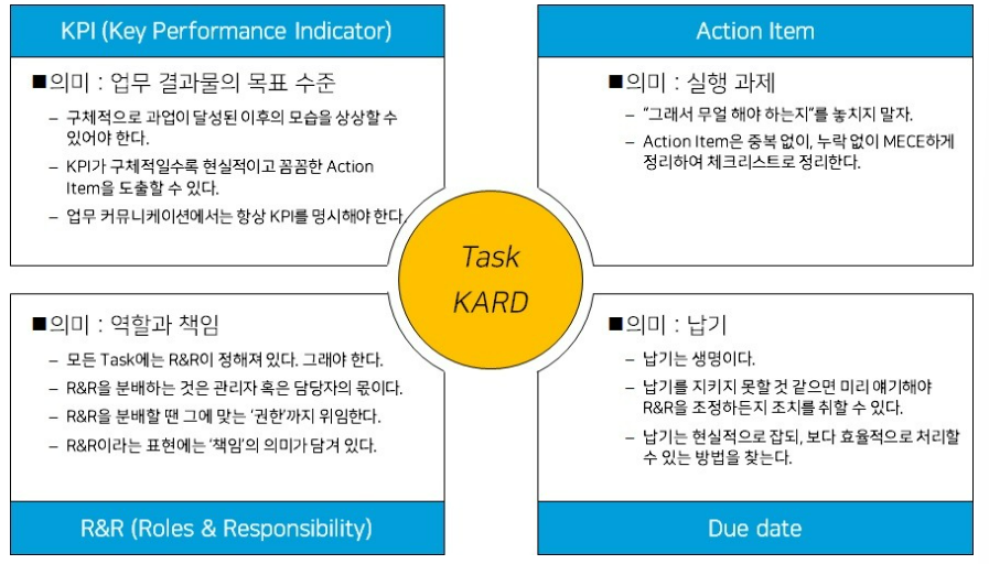 모든 업무에 Task KARD를 적어보길 권한다(KPI, Action Item, R&R, Due date). 이 개념들을 머리로만 알고 있어선 현업에서 사용할 수 없다. 업무를 주고 받는 커뮤니케이션 상황에서, 회의 시간에, 프로젝트 PM을 맡았을 때 등등 모든 순간에 무의식적으로 떠올려야 한다. Task의 핵심 요소가 제대로 파악되지 않았을 때 "그런데 납기는 언제까지죠?", "정확히 몇 개나 필요하죠?", "이 파일이 어디에 쓰이는 건가요?" 라고 묻자. 그래야 일을 두 번, 세 번 하지 않는다.