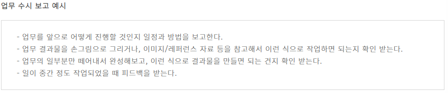 - 수시로 보고해야 업무 결과물 수준을 합치시킬 수있다.