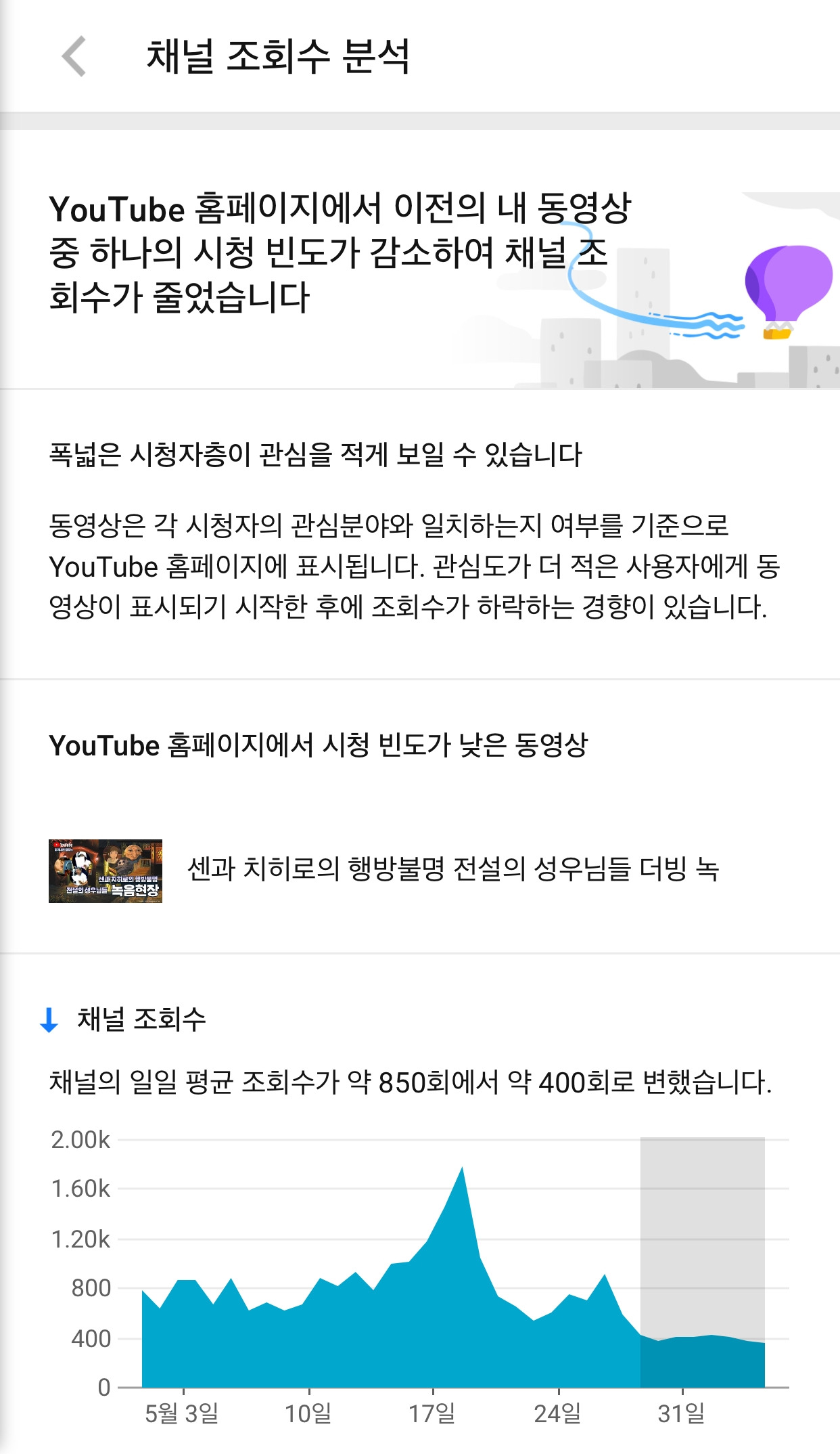 그런데 구독자들의 관심분야와 다르다면서 노출횟수가 줄어들게되었고 그 결과 영상 조횟수는 물론이고 채널 조횟수도 감소되었다는 내용이었다.