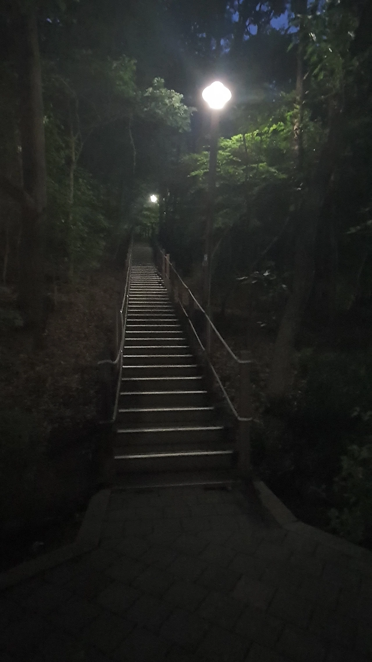 기구운동?을 끝내고 계단을 오를까 했는데, 이른 시간인 데다가 먹구름 탓인지 더욱 심하게 깜깜하다. 아니 언제는 어둠의 자식이라더니... 계단 위쪽은 더 어두워 보이는 게 아무래도 다시 공원 바깥쪽으로 나가야겠다. 어둠의 자식치고 엄청난 개복치 심장이라 어쩔 수 없다...