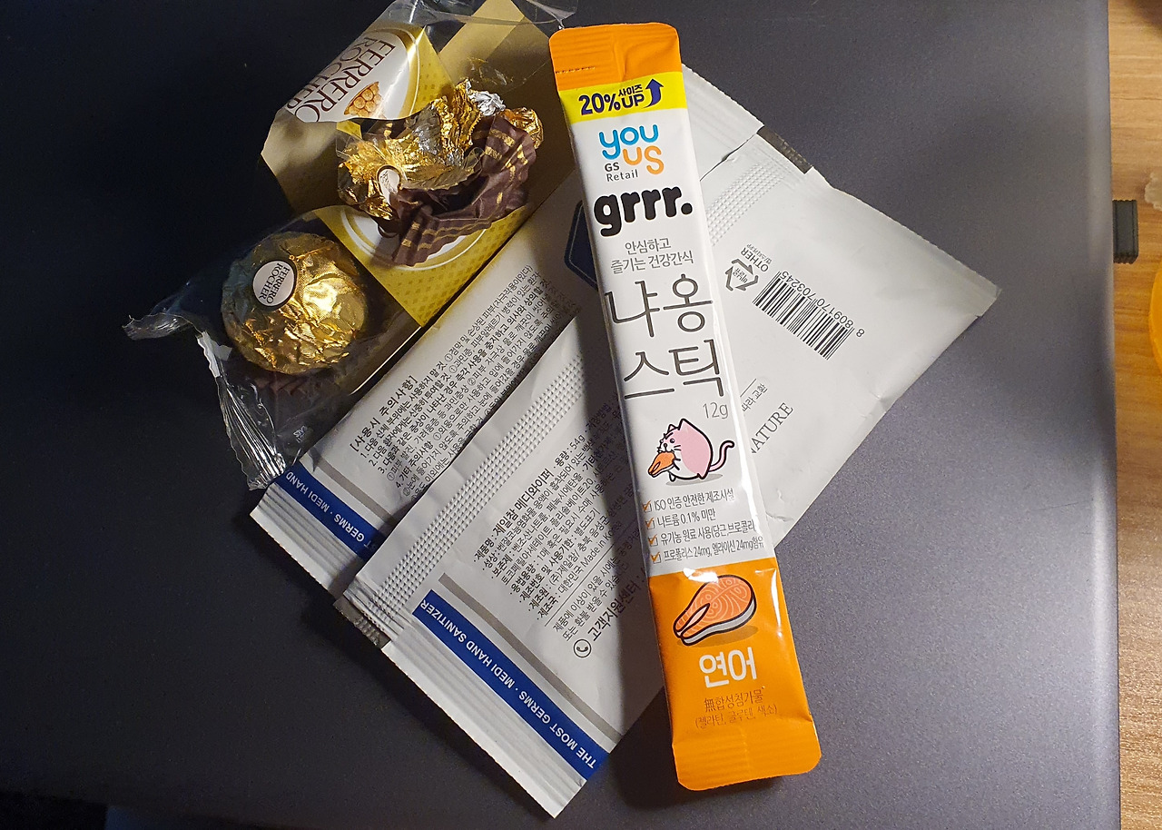 땀복 주머니에 들어 있던 것들을 노트북 위에 꺼내 놓았다. 페레로 로쉐 한 알, 물티슈, 츄르.