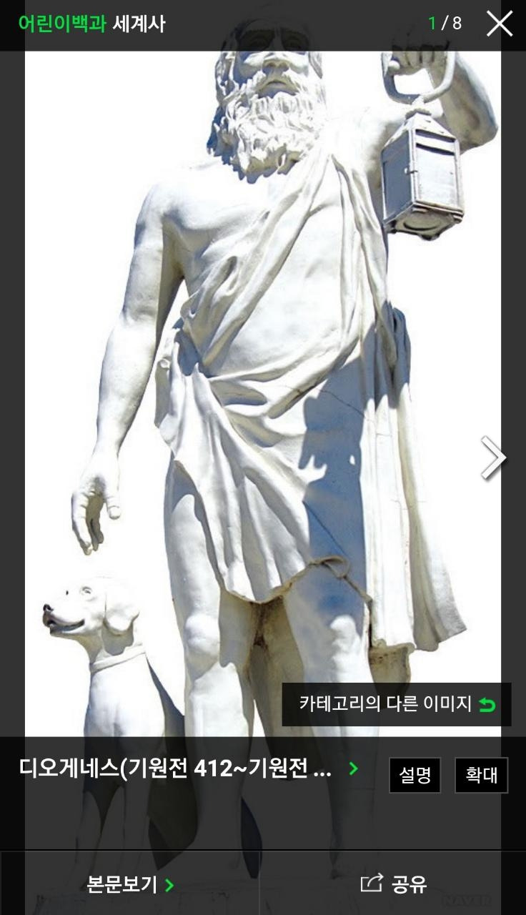 견유학파, 욕심을 버리고 개처럼 살면 행복하다고 주장한 대표적인 견유학파, 낮에도 등불을 들고 다닌 것으로 유명하다