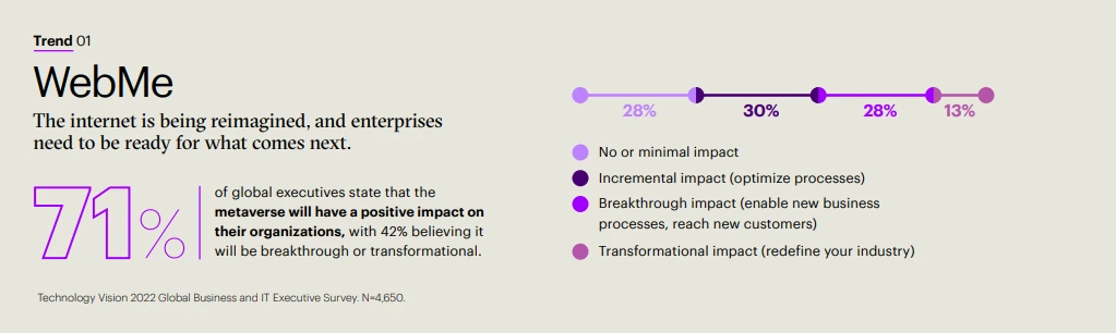 Accenture 설문 조사 응답자의 71%에 따르면 메타버스로 의 전환 은 비즈니스에 긍정적인 영향 을 미칠 것이며 42%는 "혁신적" 또는 "변혁적"이 될 것이라고 말했다.