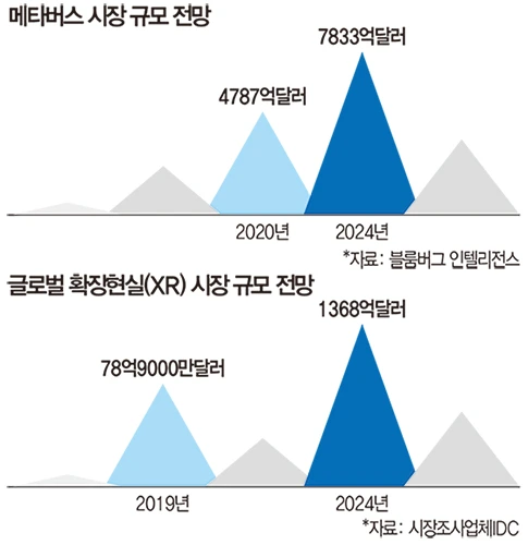▶VR·AR 기술 메타버스에 필수 최근 정보기술(IT) 업계에선 지난해 전 세계를 강타했던 ‘메타버스’ 광풍이 수그러들고 있다는 말이 심심찮게 들린다. 메타버스 시장은 결국 이를 뒷받침하는 하드웨어 발전이 선행되면서 이뤄질 것이라는 예상이 나온다. 거품이 꺼지고 기술이 남은 뒤, 현실화하는 과정이다. 블룸버그 인텔리전스에 따르면 메타버스 시장 규모는 2020년 4787억달러에서 2024년 7833억달러로 성장할 것으로 예상된다.
