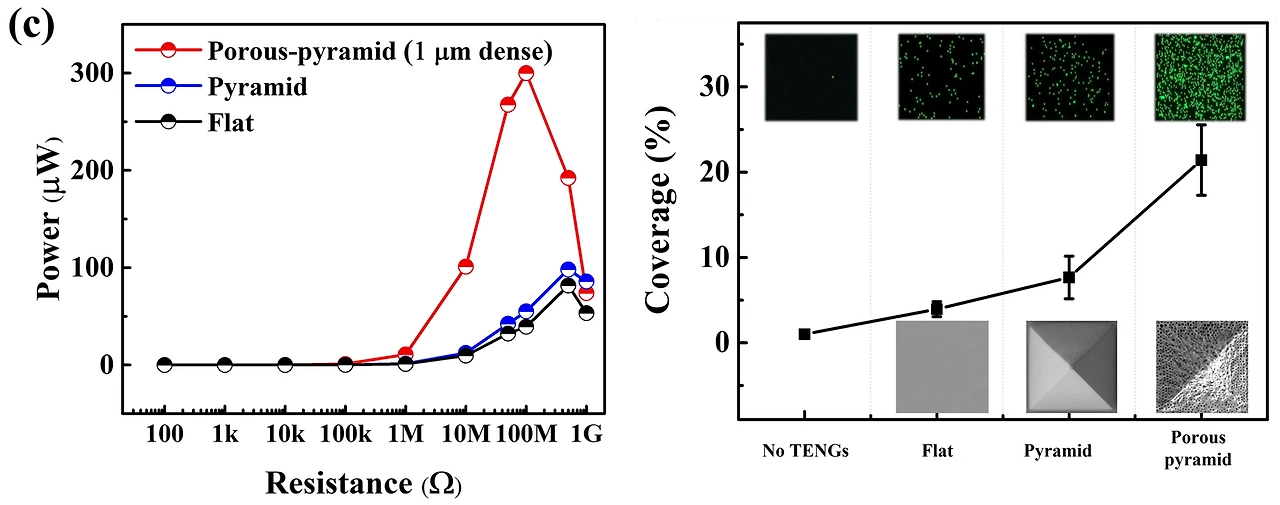 또한 DGIST 연구팀은 고전압의 출력을 만들어내기 위해 3차원 다공성 피라미드 미세구조의 마찰대전 발전소자를 새로 개발했다. ‘2cm x 2cm’ 샘플 기준 일반적으로 쓰이는 평면구조의 출력량은 8V인 것에 비해, 3차원 다공성 미세구조 소자의 출력량은 25V로 3배 이상 높은 출력을 보였다.