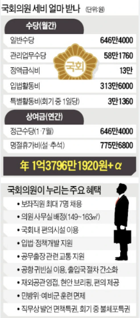 불체포 특권 한국 국회의원들이 갖고 있는 특권은 한국 국회의원들은 세비라는 명목으로 월 1300만 원, 연간 1억5700만 원을 받는다.