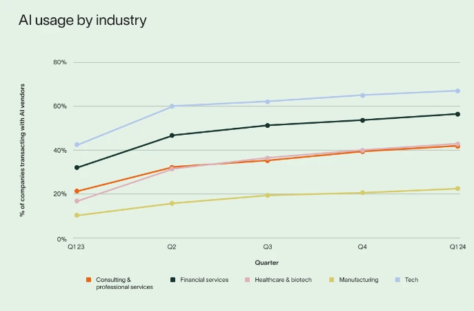 특히 주목할 점은 AI 채택 산업군의 변화입니다. 기술 전문 기업들이 여전히 AI 채택에서 앞서가고 있지만, 비 기술 분야의 기업들 역시 AI 채택을 빠르게 늘리고 있는 추세입니다. 의료 및 생명공학 분야에서는 무려 131%의 증가율을 보이며 기술 산업의 45% 증가율과 대비됩니다. 금융 분야에서는 AI 기술에 대한 지출이 전년 대비 331%나 증가했다는 점에서 이 분야의 급격한 변화를 엿볼 수 있습니다.