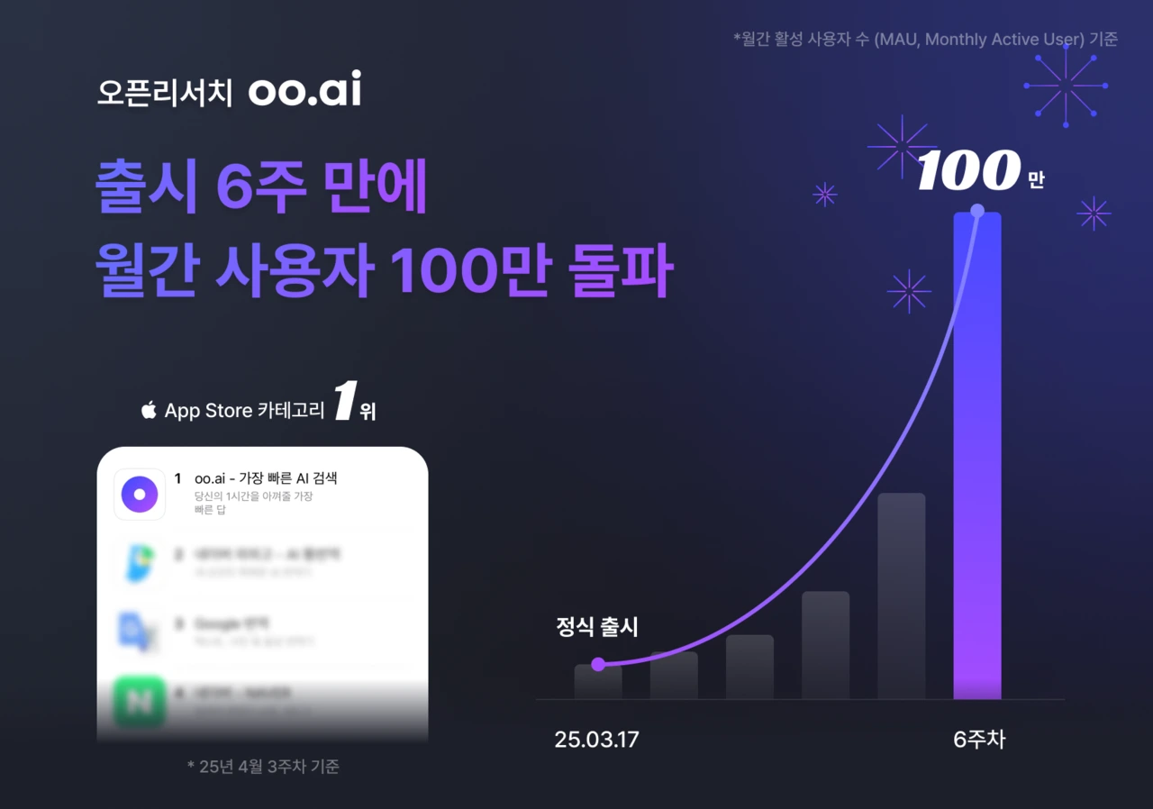 국산 스타트업 오픈리서치가 선보인 인공지능(AI) 검색 엔진 **‘오오에이아이(oo.ai)’**가 출시 6주 만에 월간 활성 이용자(MAU) 100만명을 돌파했다.
