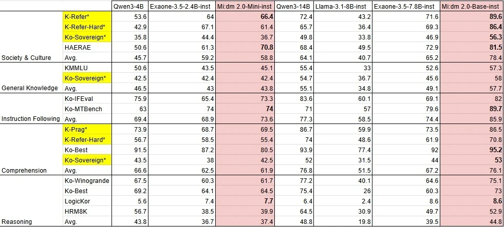 ‘믿:음 2.0’은 한국어에 있어 독보적인 이해도를 보였지만, 글로벌 기준의 영어 벤치마크에서 엑사원 3.5나 라마 3.1, 큐원3와 같은 모델들에 비해서는 상대적으로 낮은 성능을 보였다. 이는 ‘믿:음 2.0’이 명확히 한국어에 특화되어 개발되었음을 시사하며, 영어 성능까지 겸비한 글로벌 모델과는 지향점이 다르다는 점을 분명히 한다.