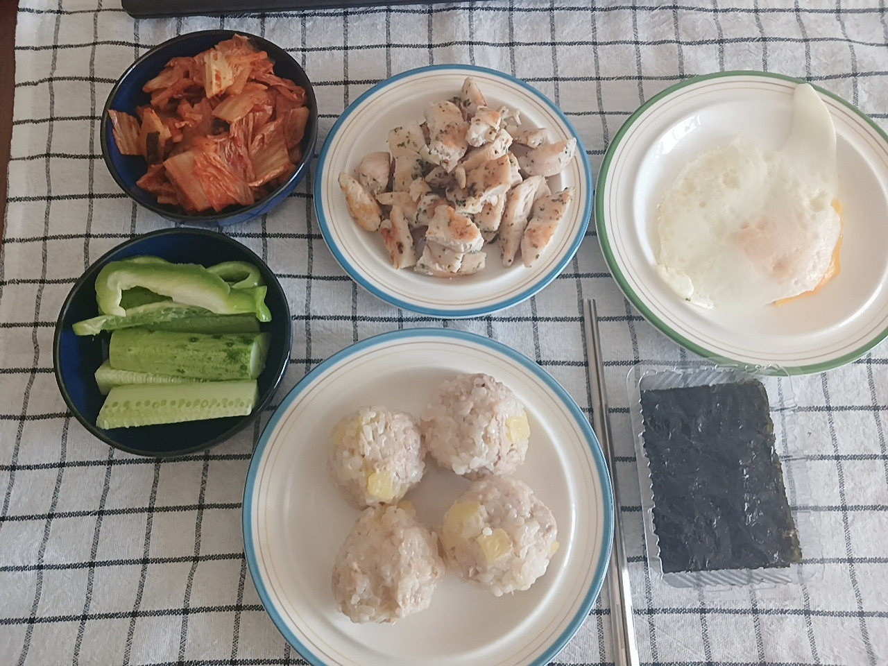 친구에게 독립 선물로 받은 멋진 접시에 공룡알 주먹밥 네 개를 신중하게 배열한다. 좀 많은가 싶지만 걱정이 무색하게 순식간에 먹어치울 것을 그간의 경험으로 안다. 탄수화물에 치우친 식단 같아 단백질 보충용으로 냉동 닭안심도 굽고, 계란후라이도 하나 부치고, 닭안심만 먹으면 심심할까 봐 묵은지도 썰어서 한 접시 준비하고, 야채 칸에 잠들어 있던 오이와 피망을 스틱 모양으로 썰어 섬유질도 챙겼다. 밥을 차려놓고 봤을 때도 좀 많은가 싶었는데 이렇게 글로 써놓고 보니 진짜 많다. 이래서 살이 안 빠지나 보다. 코끼리도 풀만 먹는다는 모 트레이너의 일갈이 떠오른다.