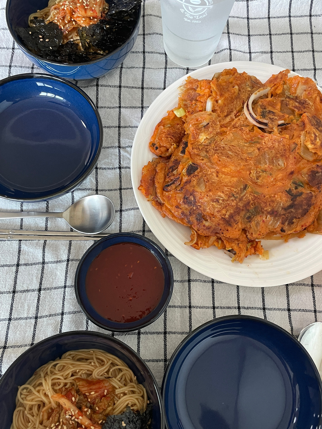 메뉴는 김치전과 간장비빔국수로 정했다. 원래 김치전은 비 오는 날 먹어줘야 제맛이지만, 아쉽게도 김치전이 먹고 싶을 때마다 귀신같이 날씨가 쨍쨍한 탓에 매번 구름 한 점 없이 맑은 날 대뜸 김치전을 부쳐먹는 사람들이 됐다. 오늘도 예외는 아니었다. 그러거나 말거나 김치전은 먹고 싶을 때 먹는 게 제일. 집에 돌아와서 간단하게 청소를 한 우리는 각자 김치전과 간장비빔국수 만들기에 돌입했다.