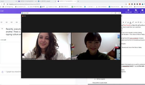 제가 최근 가장 고마움과 즐거움을 느꼈던 수업은 Kayleah 선생님과의 수업이었어요. 실리콘밸리 스타트업을 거쳐 현재 오라클에서 근무하고 있는 배경 때문인지 교재의 내용에서 현재 제가 하고 있는 일에 대한 이야기까지 범위를 넓혀 깊이 있는 대화를 할 수 있다는 것이 가장 좋았고, 제가 말하는 문장의 90%가량을 실시간으로 모두 받아 적고, 꼼꼼하게 교정해주는 부분도 매우 인상적이었어요.