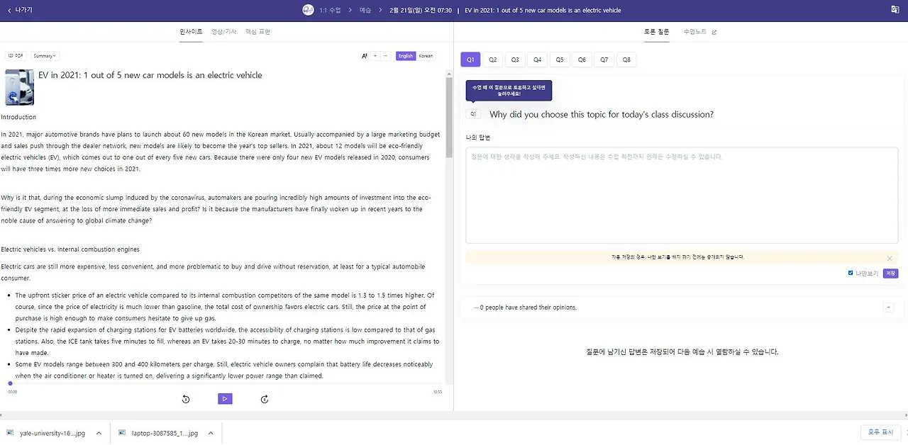 수업 (선생님과 토론, 전체적인 내용과 문법 그리고 개선점에 대한 피드백)