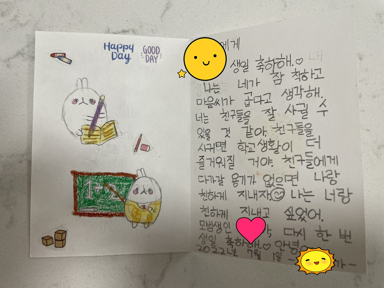서영아, 생일 축하해 ♡ 나는 네가 참 착하고 마음씨가 곱다고 생각해. 너는 친구들을 잘 사귈 수 있을 것 같아. 친구들을 사귀면 학교생활이 더 즐거워질 거야. 친구들에게 다가갈 용기가 없으면 나랑 친하게 지내자. 나는 너랑 친하게 지내고 싶었어. 모범생인 서영아, 다시 한번 생일 축하해. ♡ 안녕~