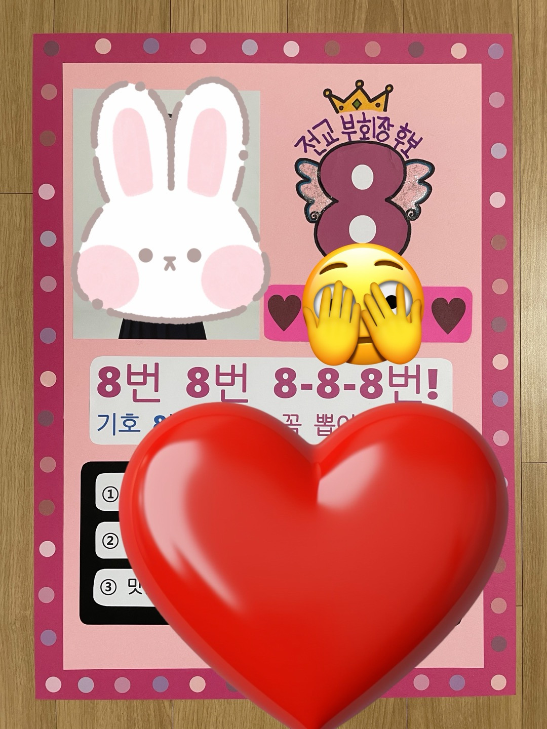 번호 추첨 날, 딸은 기호 8번을 뽑아왔다. e-알리미로 역대 당선 번호를 보니 거의 1번 아니면 2번이었다. 만만치 않겠구나. 그래도 8월에 태어난 우리 아이에게 8번은 행운의 숫자일 거라며 긍정의 힘을 불어넣어 본다. 인터넷에서 마음에 드는 벽보 검색한 뒤 디자인 정하고, 알파문고에서 마멀레이드지 사다가 정성스레 만들어본다. (학교마다 다르긴 하지만 자체제작 벽보만 가능한 곳도 있는데 우리 아이 학교는 그런 규정이 없어서 업체 제작 벽보를 낸 아이들이 2/3가 넘었다. 선거운동용 피켓까지 합쳐 15만 원이나 들었다는 아이도 있으니, 만만치 않은 학생선거다.) 우리는 대신 사진에 힘줬다. 혹시나 떨어진다 해도 멋진 사진은 남으니. 연설문은 아이의 초고에 엄마의 퇴고, 퇴고, 퇴고. 여러 번 다듬고 완성한 연설문을 들고 강조해야 할 부분, 억양, 목소리 크기 등 연습, 연습, 연습.