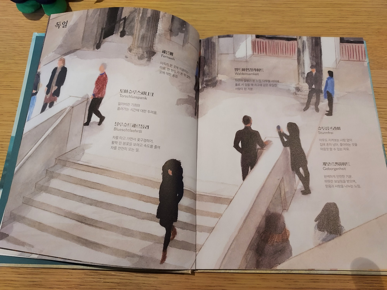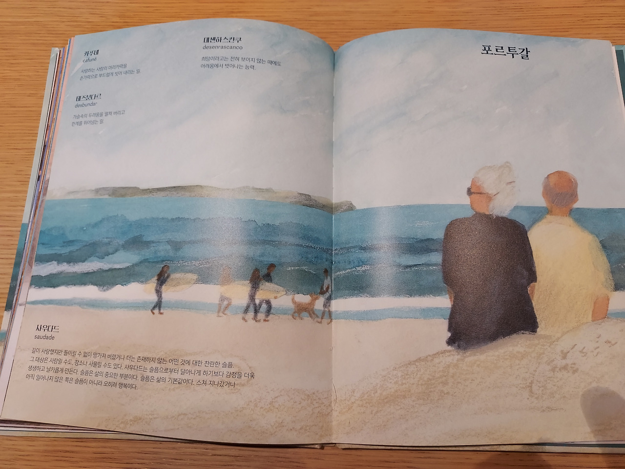 책의 표지이기도 한 포르투갈을 펼치면 '카푸네'라는 단어가 책의 맨 위에 자리하고 있습니다. 바다를 보고 앉은 두 사람이 가까운 곳에 그리고 멀리 일군의 사람들과 바다가 보입니다. 사랑하는 사람의 머리를 부드럽게 손가락으로 빗어내리는 일이라는 설명이 있습니다. 얼마나 따스한 말인가요. 그리고 그 밑에는 '사우다드'를 설명하는 글이 있습니다. 요즘 유행하는 쇼펜하우어의 철학과 비슷합니다. 슬픔은 삶의 기본값이다. 행복이란 건 이미 스쳐갔거나 아직 일어나지 않은 일이라고 말하지요. 쇼펜하우어는 고통과 슬픔이 오히려 긍정적이라고 말합니다. 그것을 통해서야 우린 행복을 아주 극렬하게 갈망하고 느낄 수 있으니까요. 행복한 시간엔 시계를 보지 않는다는 말은 그 시간이 순식간에 지나기도 하지만 그 안에 있을 때는 행복이란 걸 느끼기 힘드니까요. 맑은 공기가 우리에게 얼마나 소중한지를 미세먼지 없는 날에 깨닫게 되는 것처럼요.