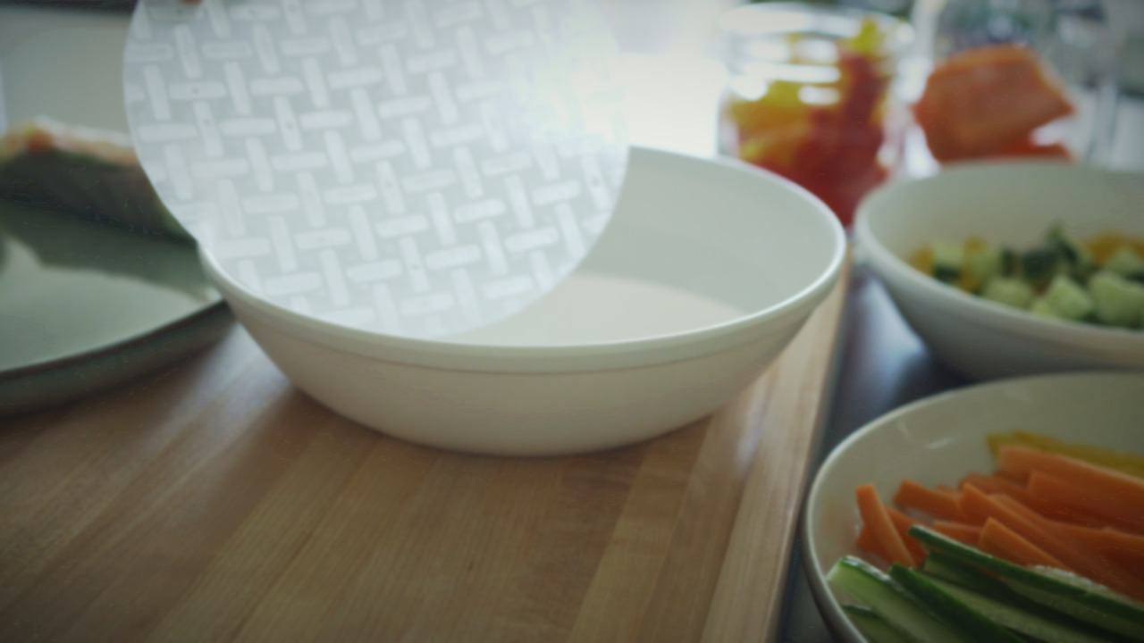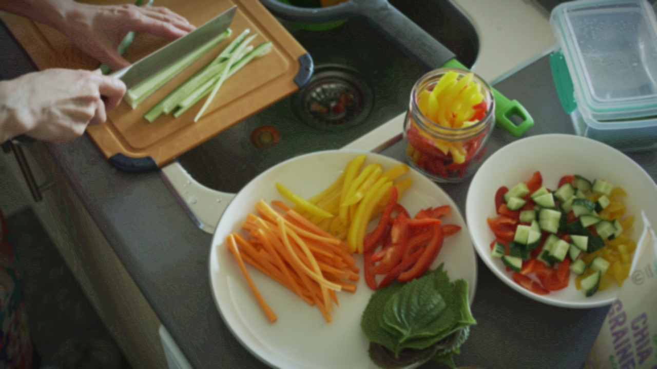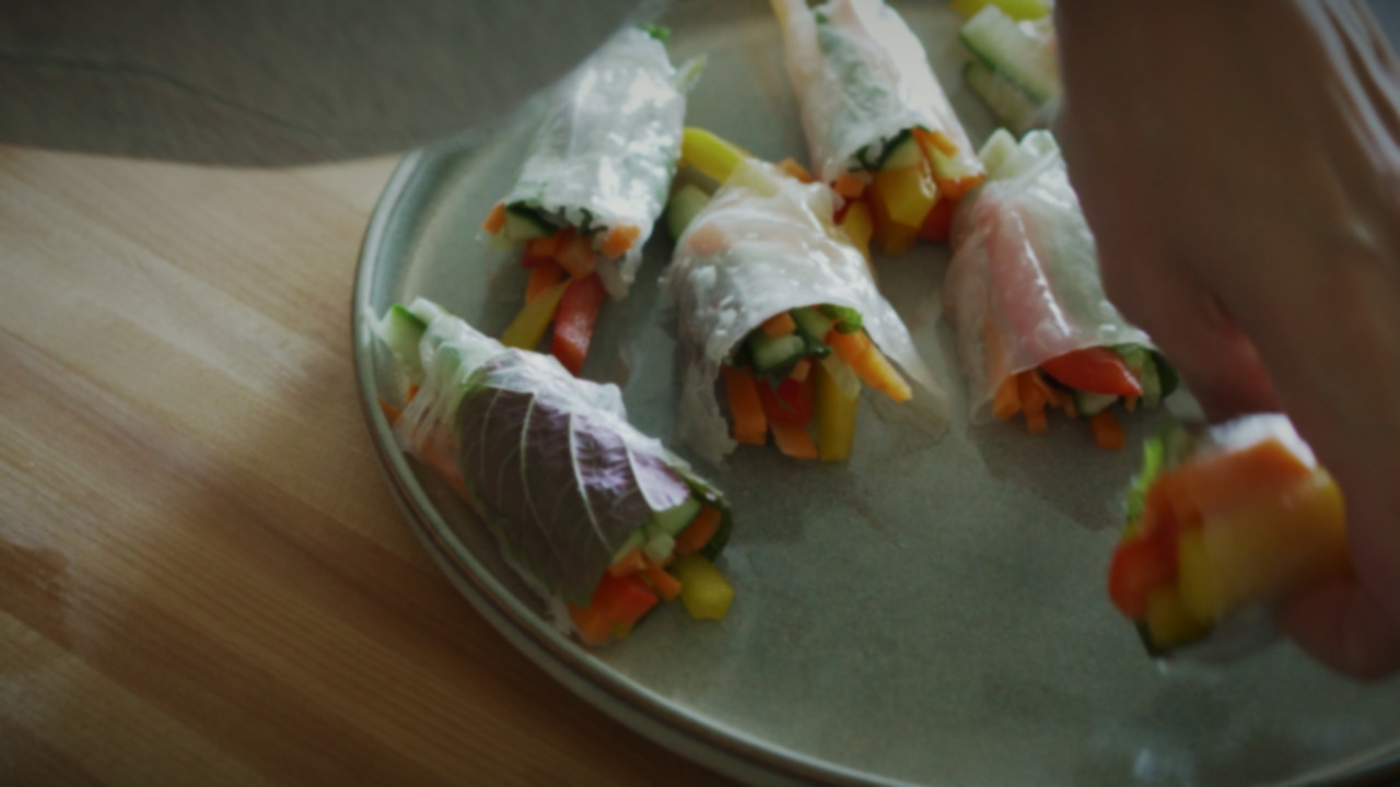 냉장고 속 야채들을 싱싱할 때 먹기 위해 라이스페이퍼에 싸서 가벼운 브런치를 만들고 있어요.