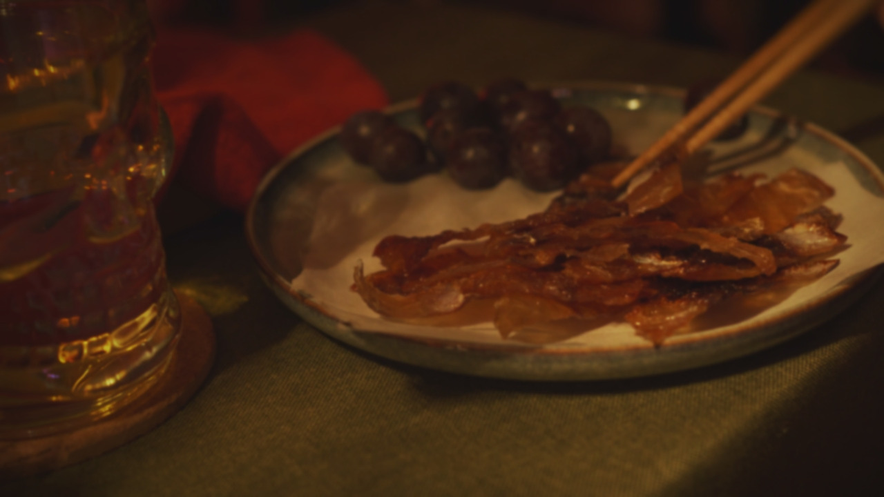 올리브유를 두른 팬에 쥐포를 노릇하게 구운 뒤, 사과주스와 함께 오늘 밤의 간식을 준비했어요.