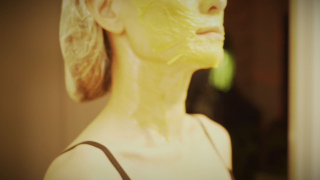 얼굴에는 빈 마스크 시트를 얹고 그 위에 노른자 팩을 살짝 덧발라 주었어요.