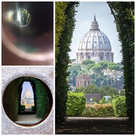 이곳엔 몰타 기사국의 건물이 있다. 기사국? 나라? 맞다. 몰타 기사국도 나라다. 잠긴 문의 열쇠 구멍으로 보면 정원 나무들 끝에 바티칸의 베드로 성당이 정면으로 보인다. 짜 맞춘 것처럼 정확하다. 폰으로 아무리 찍어봐야 안 나온다. 눈으로 보시라.