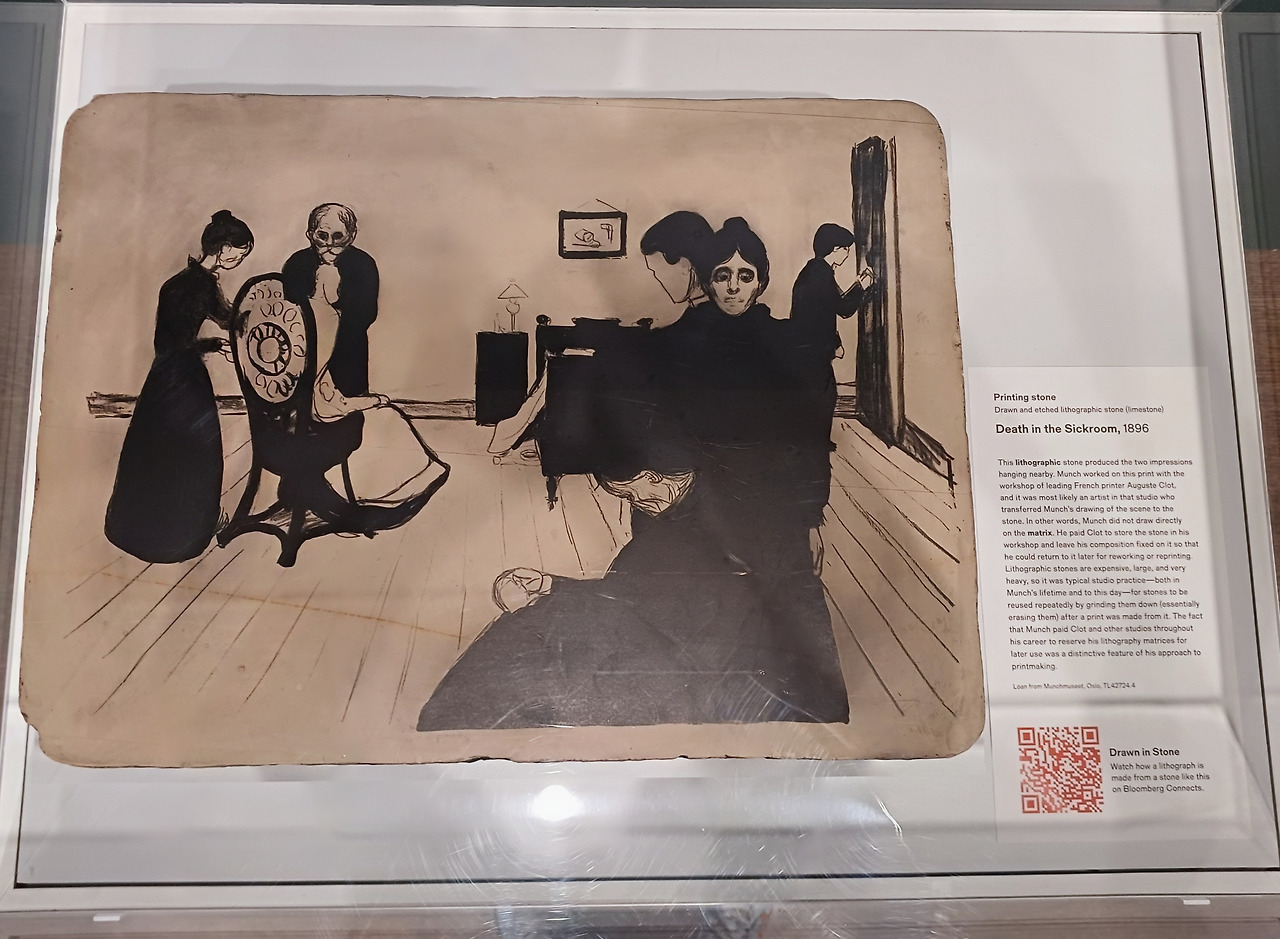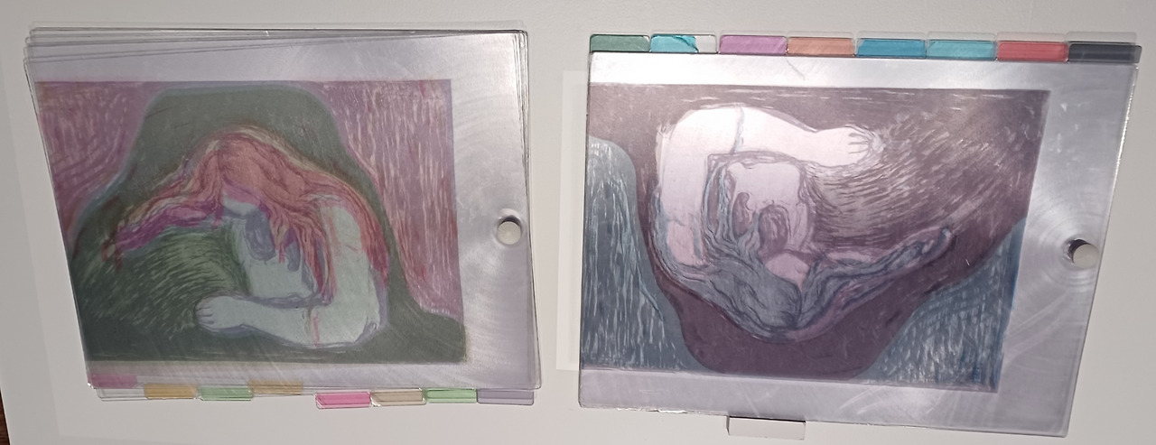 첫 번째 사진은 석판화의 원본인 인쇄용 돌이다. 직접 돌에 그린 것이 아니고, 이미 그린 드로잉을 돌에 옮겼다고 한다. 항상 뭉크는 원본인 돌을 중시하여 자신의 아뜰리에에 보관하고 나중에 재인쇄하거나 여러 다른 방식으로 인쇄하였다. 다른 판화가들이 돌 값이 비싸서 판화용 돌을 깎아서 다른 작품을 또 그리는 재사용을 한 것에 비해 부자였던 뭉크는 판화용 원석을 그대로 보관하고 좋은 돌을 선점하기 위해 항상 예약하는 플렉스를 누렸다고 한다.