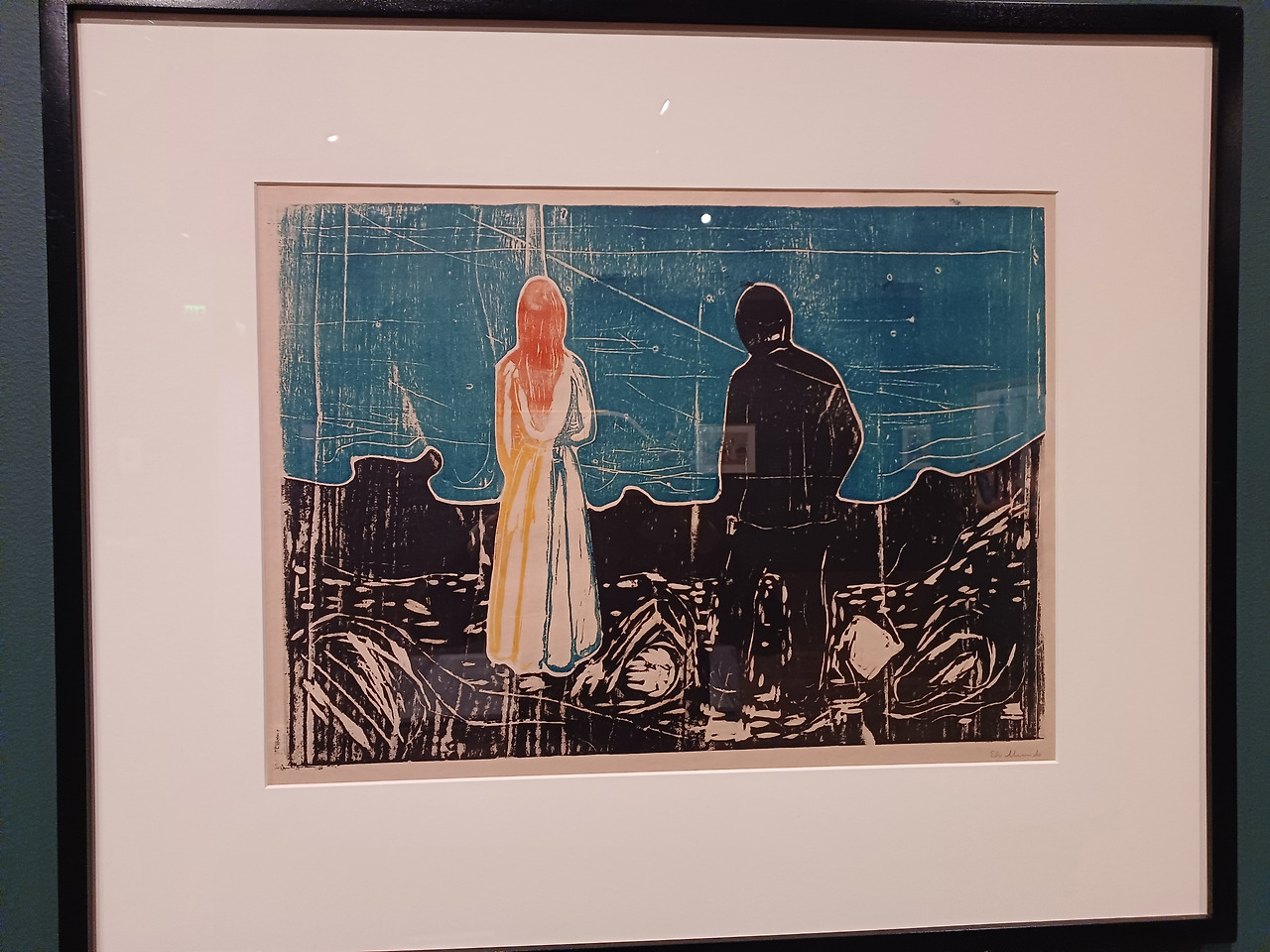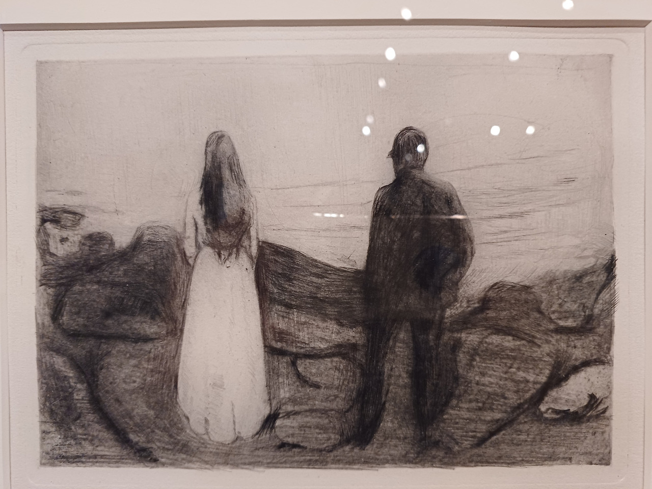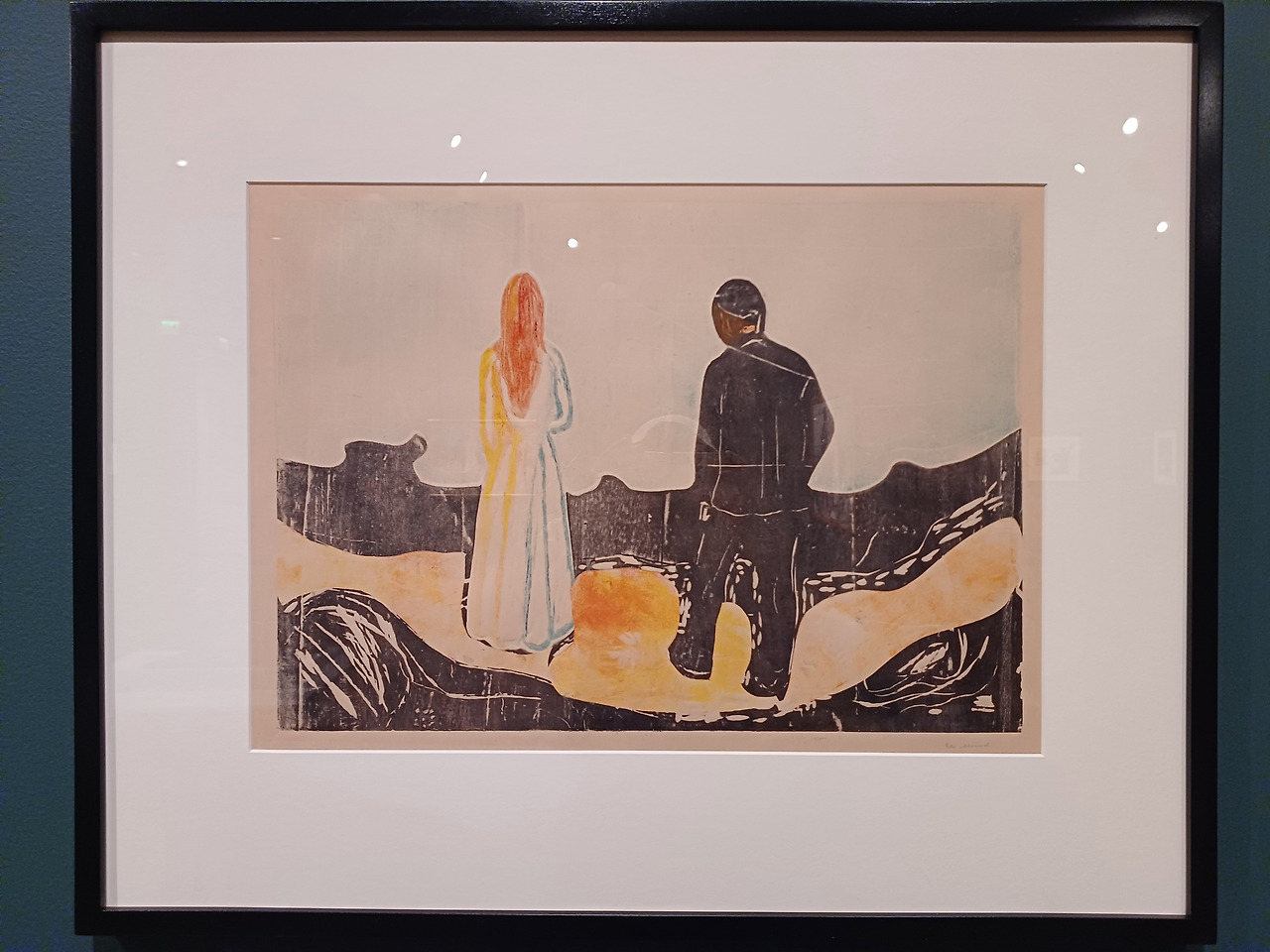 처음으로 관객들을 맞이한 작품은 <Two human beings(The lonely ones); 두 사람(외로운 사람들)>이다. 바다를 바라보며 관람객들에게 등을 돌리고, 나란히 같이 서 있지만 서로 고립된 감정을 나타낸다. 공간적 정서적으로 근접성과 거리감 사이의 긴장감을 나타내는 이 작품은 작가가 자주 다루는 외로움을 소재로 한 것 중 가장 뛰어난 작품이라고 한다. 1892년에 회화로 그리고 2년 뒤 에칭(동판화)으로 만들고, 1899년부터는 목판화 시리즈로 이어졌다고 한다. 반복적인 인쇄로 목판의 훼손이나 심하게 희석된 페인트로 인해 페인트 층의 흐름과 같은 의도하지 않은 예술적 과정이 잘 드러나서 그 자체로도 다양하고 풍부한 감흥을 준다.