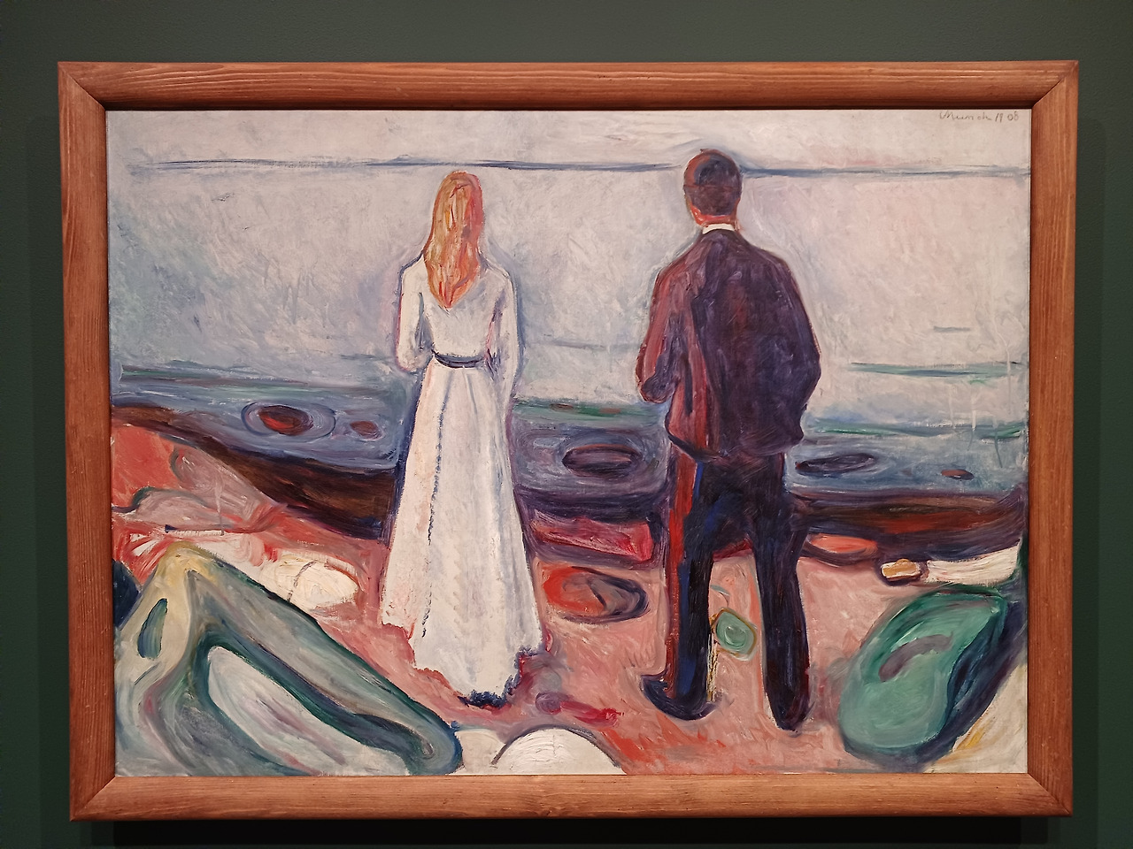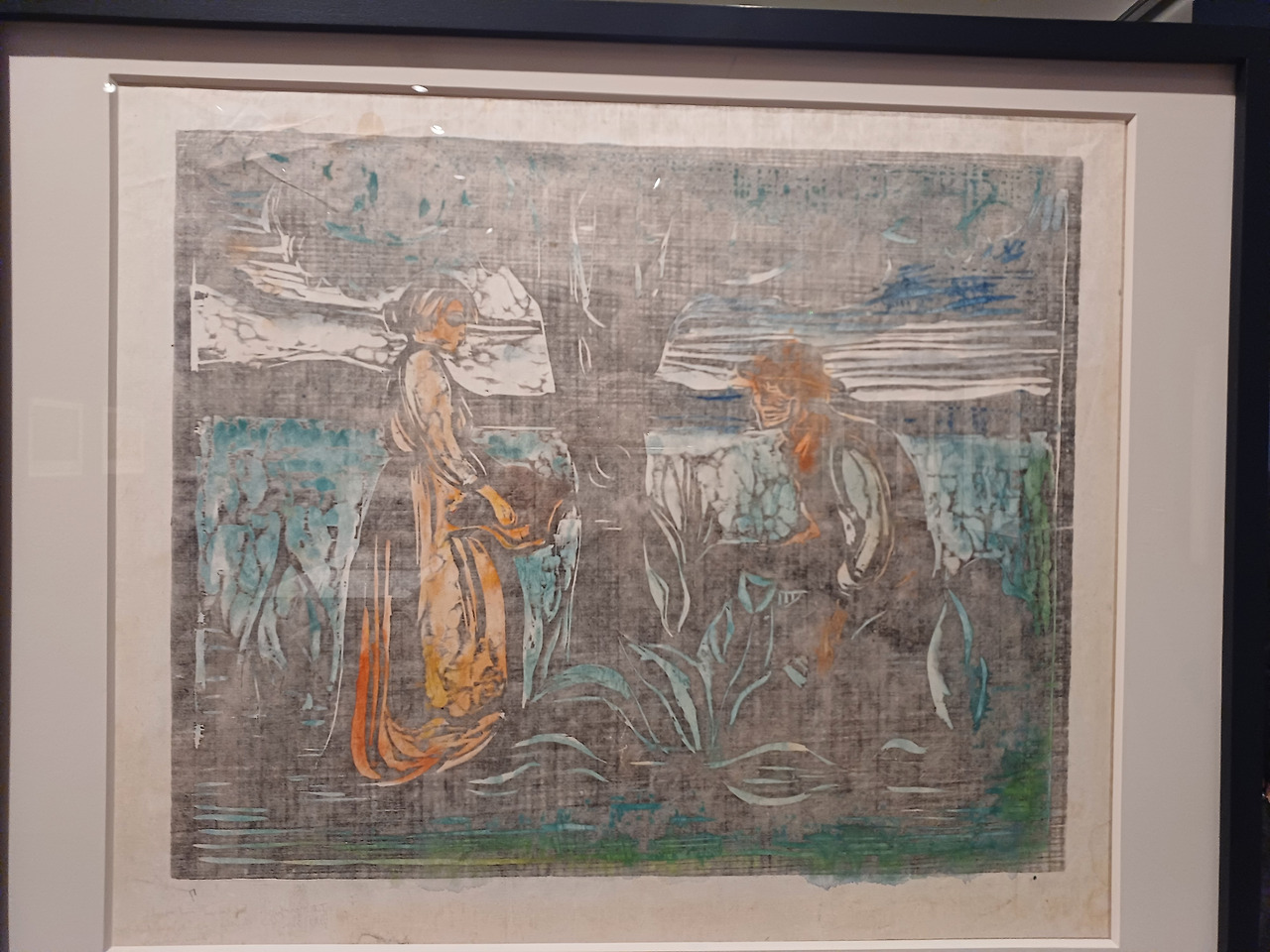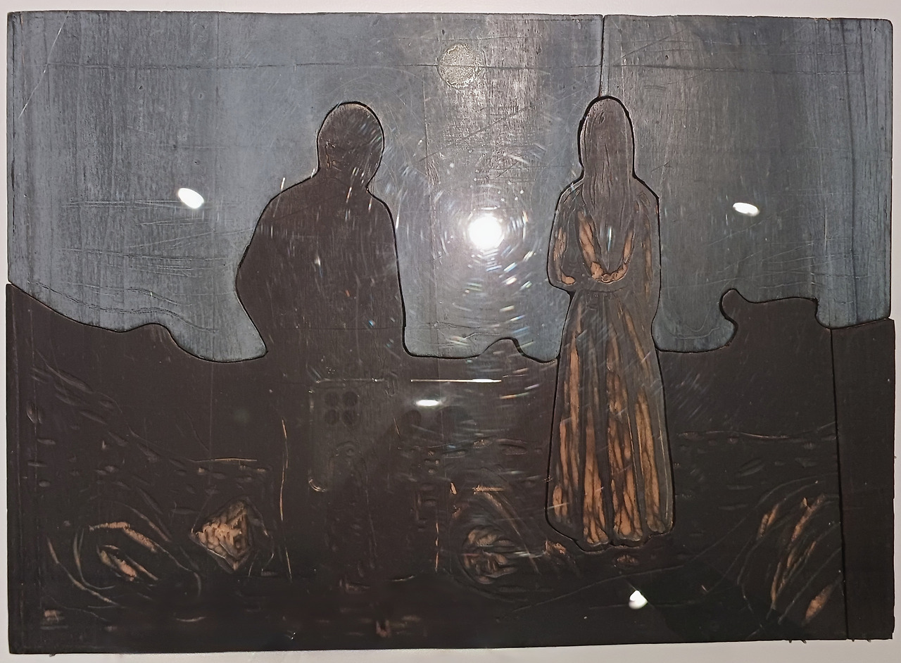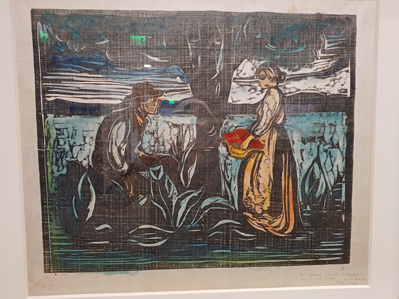 처음으로 관객들을 맞이한 작품은 <Two human beings(The lonely ones); 두 사람(외로운 사람들)>이다. 바다를 바라보며 관람객들에게 등을 돌리고, 나란히 같이 서 있지만 서로 고립된 감정을 나타낸다. 공간적 정서적으로 근접성과 거리감 사이의 긴장감을 나타내는 이 작품은 작가가 자주 다루는 외로움을 소재로 한 것 중 가장 뛰어난 작품이라고 한다. 1892년에 회화로 그리고 2년 뒤 에칭(동판화)으로 만들고, 1899년부터는 목판화 시리즈로 이어졌다고 한다. 반복적인 인쇄로 목판의 훼손이나 심하게 희석된 페인트로 인해 페인트 층의 흐름과 같은 의도하지 않은 예술적 과정이 잘 드러나서 그 자체로도 다양하고 풍부한 감흥을 준다.