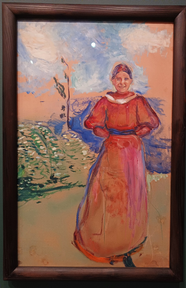 생동감 넘치는 이 초상화는 뭉크의 막내 여동생이자 사진작가인 잉에르마리뭉크를 그린 것이다. 유화와 크레용을 사용하여 무처리된 판지에 그려진 작품으로, 잉거가 붉은 드레스를 입고 정면을 향해 서 있는 모습을 담고 있다.